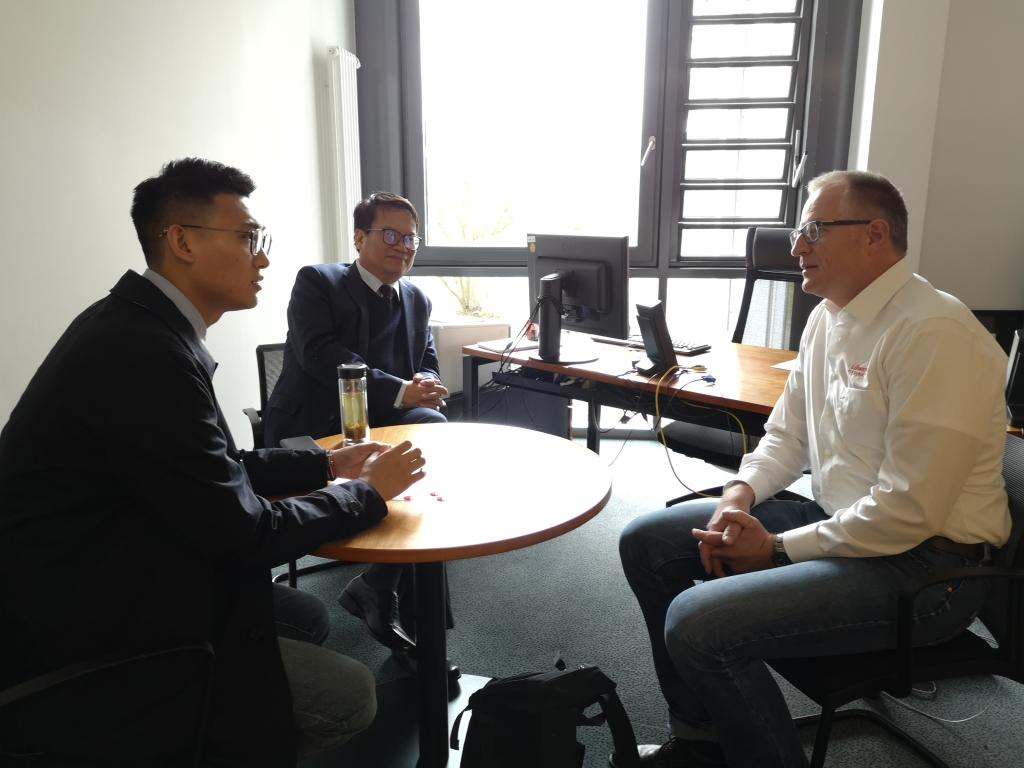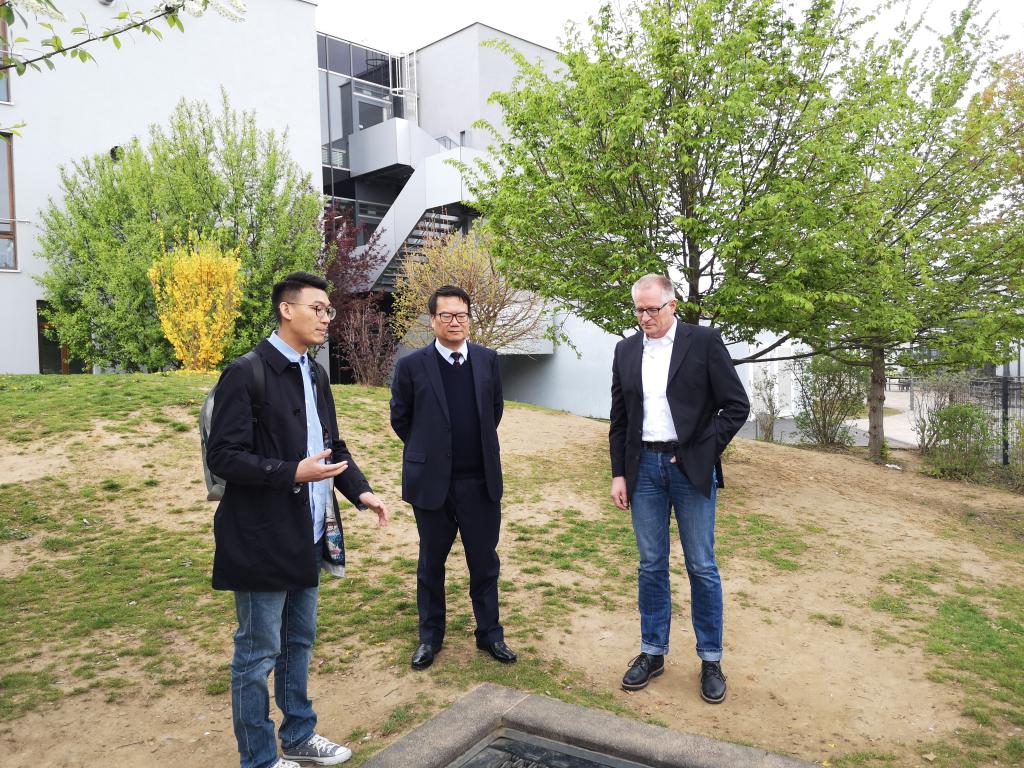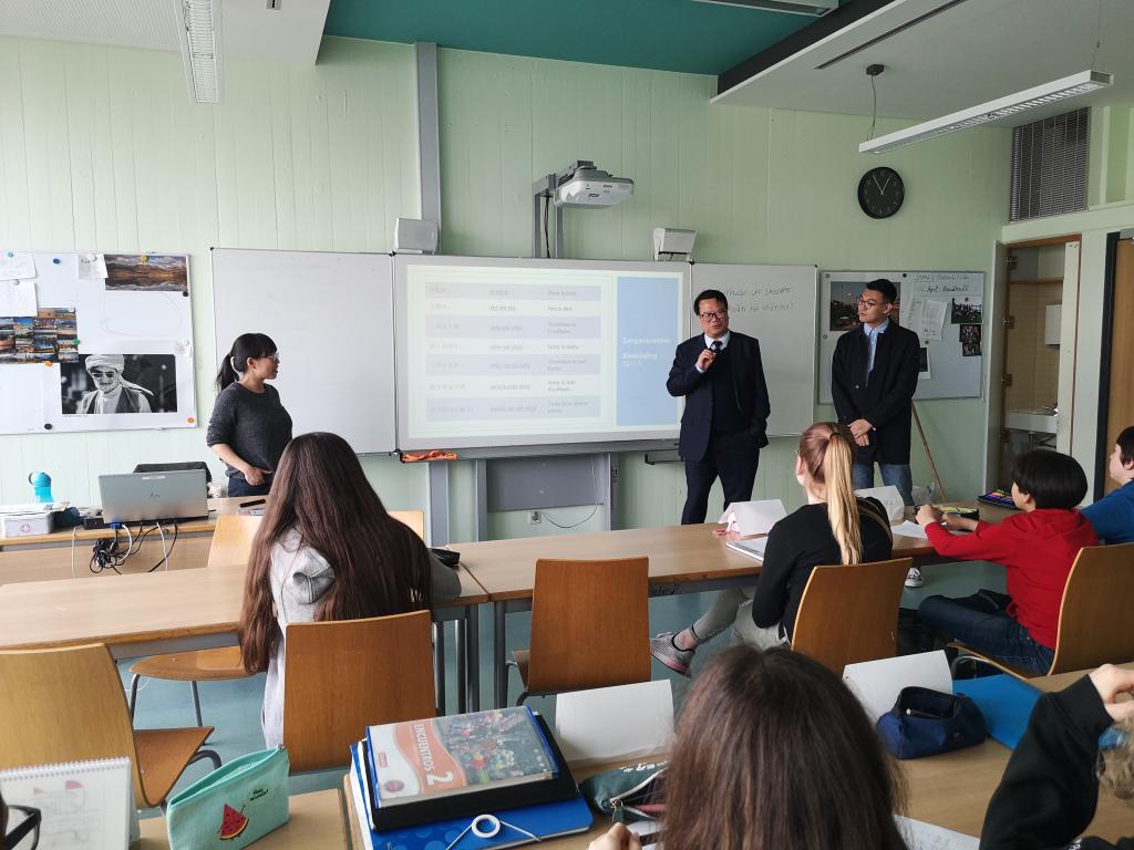 林卫民一行首先访问了德国Löwenrot文理中学,对校园的学科教室、实验室、体育馆、学生食堂及学校花园等校园基础设施进行了参观。此后,林卫民与该校校董Schmidt先生、校长Müller先生进行了会谈,双方就两校缔结姊妹校关系的前提和合作细节进行了商讨,将于今年9月和11月分别进行两次学生互访活动。与游学项目负责人Mayer先生就今年的两次学生互访活动的细节进行了商讨,确定了两校游学的行程、文化课程的内容、学生项目合作的主题及形式等。林卫民指出,Löwenrot文理中学在科技教学方面效果显著,我校对科技教学也十分重视,近年来也屡次在全球、全国、全市的各项竞赛中取得可喜成绩,希望今年的学生游学活动中,以“腾飞科技”作为学生项目合作的主题。这一提议,获得了双方的认可。随后,林卫民一行还观摩了该校的中文课堂,与该校学习中文,首批将到我校参加游学活动的德国学生见面,鼓励他们认真学习中文,并代表北外附校对他们9月份的来访表示期待和欢迎。