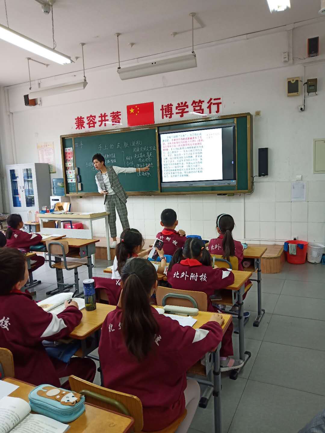 四年级林国泉老师执教的是《手上的皮肤》第二课时。课上,老师用第二自然段对学生进行引导、质疑、归纳、总结,让孩子掌握了学习说明文的方法:抓住文中主要信息,并关注相应的说明方法。然后,让学生自学文中3--5自然段,再进行小组讨论,了解手上皮肤的其他部分有什么特点和作用,以及使用的说明方法。本节课,老师注重教给学生学习说明文的方法,以学生为中心,创设支持学生自主学习、合作探究、问题解决等学习的活动空间,让孩子在掌握学习方法的同时,提升了学习能力。