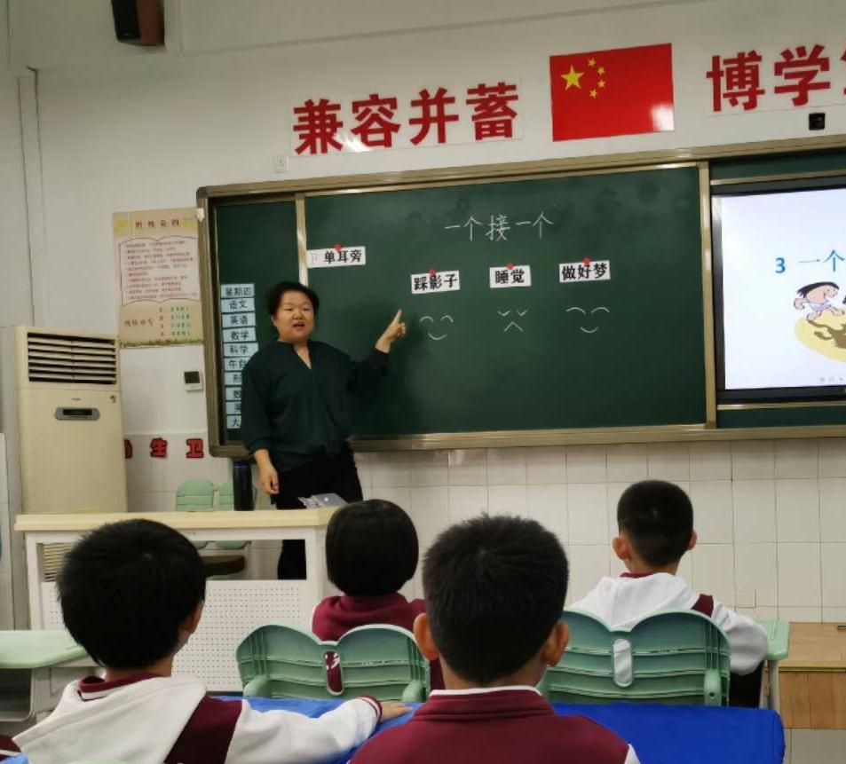 4月18日上午,韩雪老师在一(2)班执教课文《一个接一个》——一首很有意思的儿童诗,这首诗歌内容非常贴近学生的世界,用最接近儿童的语言,表达简单的内心世界。在教学过程中韩老师抓住重点,利用各种教学手段落实识、读、写等各方面的教学目标。识字过程中韩老师很重视学生已有的识字基础和识字方法,利用部件相加和偏旁置换的方法认识了一批汉字,又联系学生的生活经验,通过让学生在理解课文内容的基础上,说说自己做过的梦,帮助识记和理解“各种各样”。根据低年级学生的身心特点,结合课文设计了踩影子和跳房子的游戏环节,学生在趣味盎然的游戏中又一次复现巩固了生字。在内容理解方面先通过教师范读和图画演示,疏通文意,再联系生活实际,在师生合作演练中,体验由快乐变成沮丧,又转向开心的情感变化。