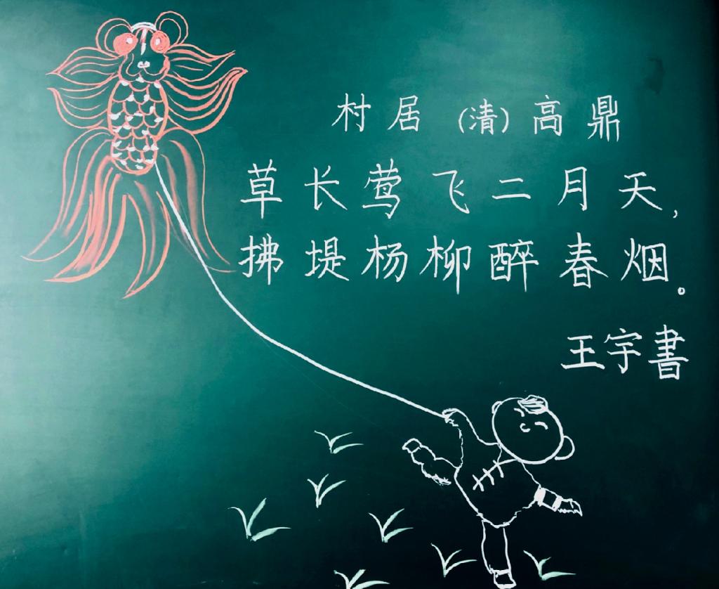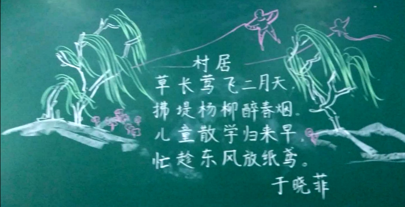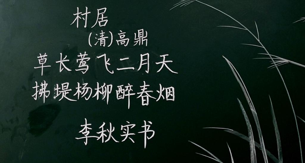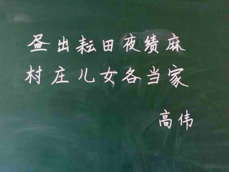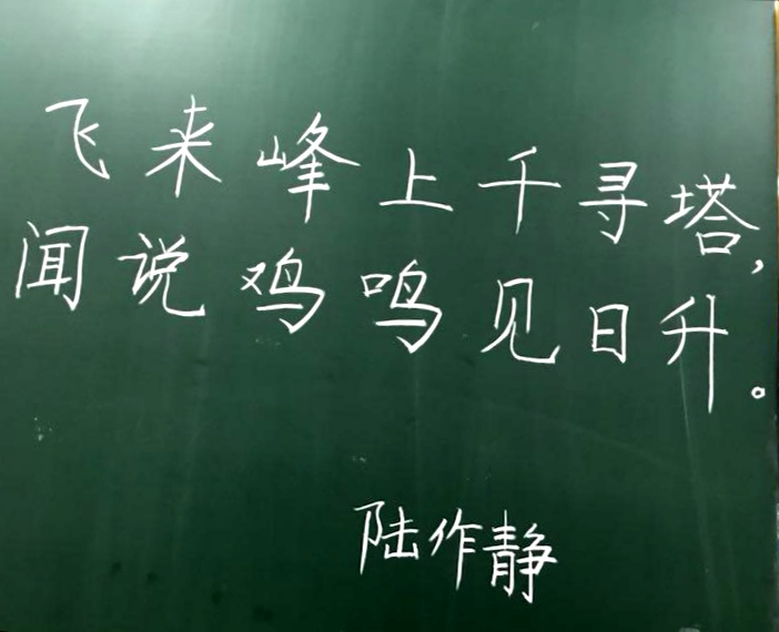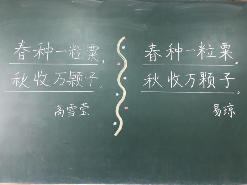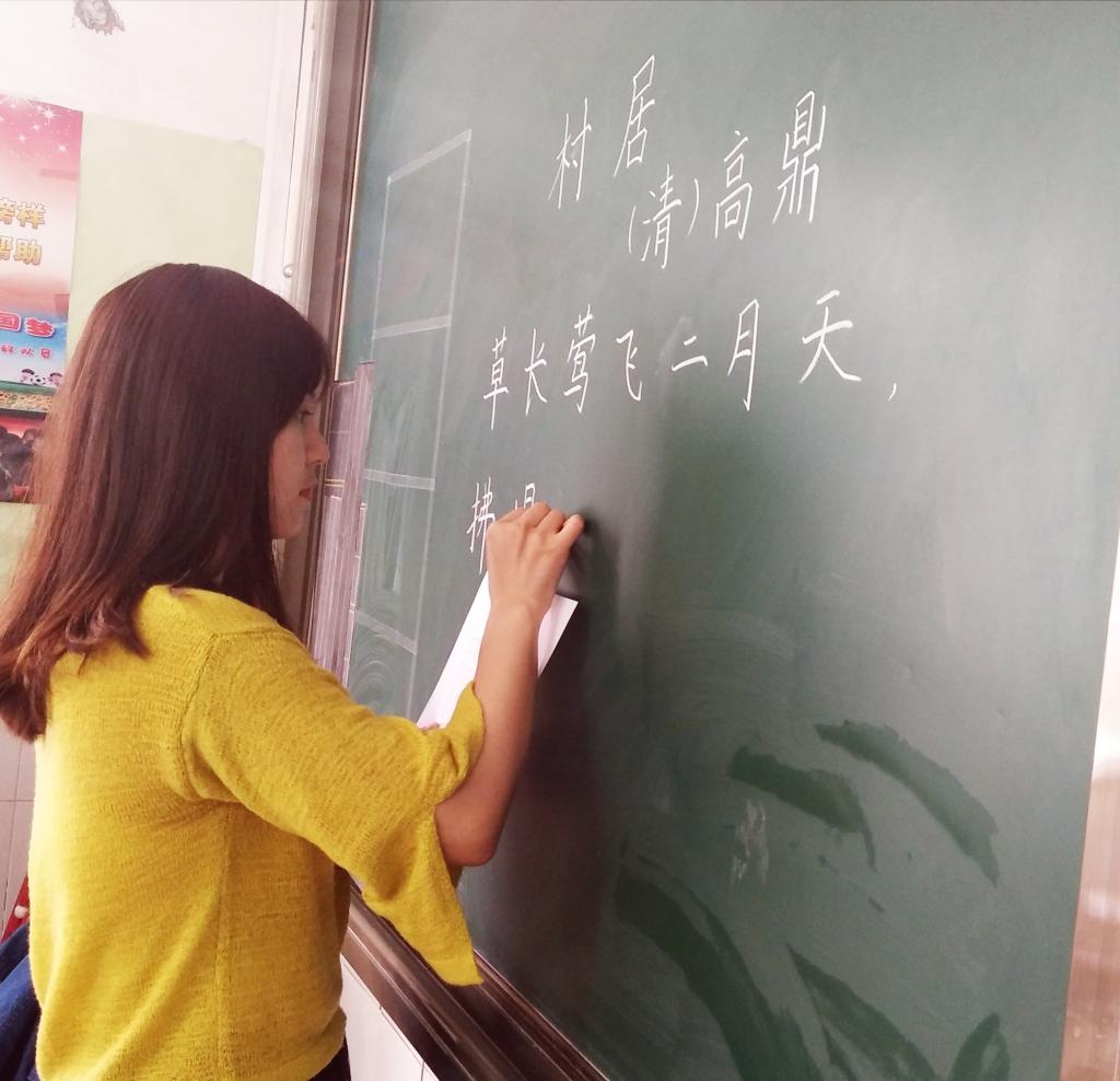所有教师被分在各自教授的年级,以本年级教材内古诗为内容,由书法教师写成模板,师生对照书写,教学相长。教师在学生面前丝毫不敢懈怠,对照范本一笔一画写的有板有眼,学生看到老师们的认真程度,自己的字也写得有模有样。最终老师们各显其能,古诗配画征服了学生,也提升了自己。