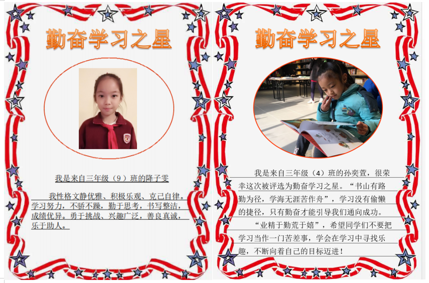 为期五周的活动中,老师们在少先队活动课上开展“勤奋学习”主题教育,平时注重对学生行为习惯的指导与纠正,组织学生自评、互学。评选出班级“班级勤奋学习之星”,并推选出一名同学作为“校园文明礼仪之星”的候选人。