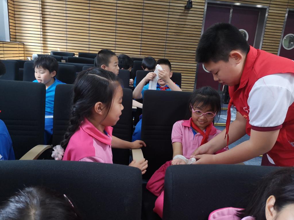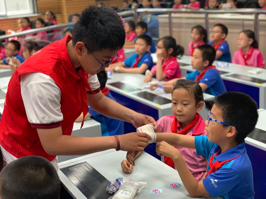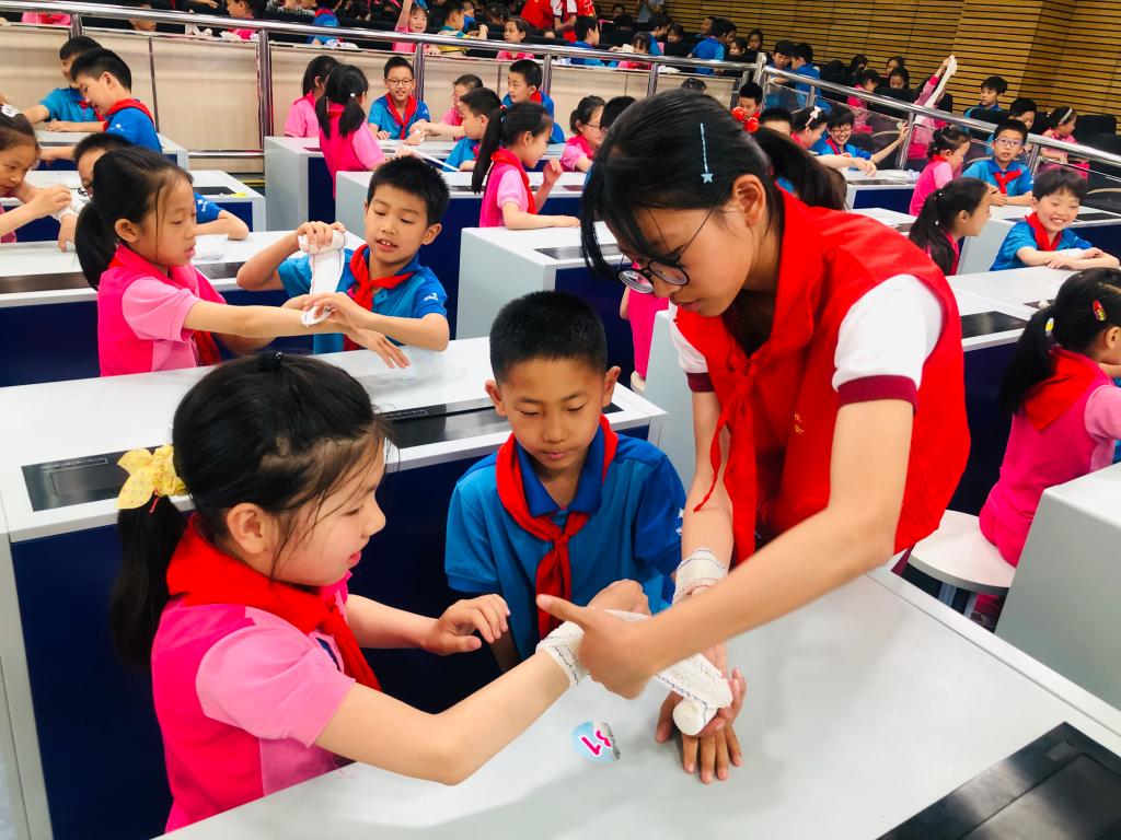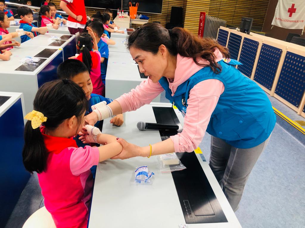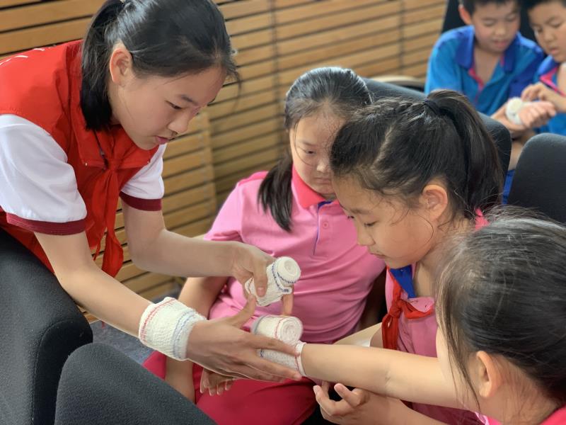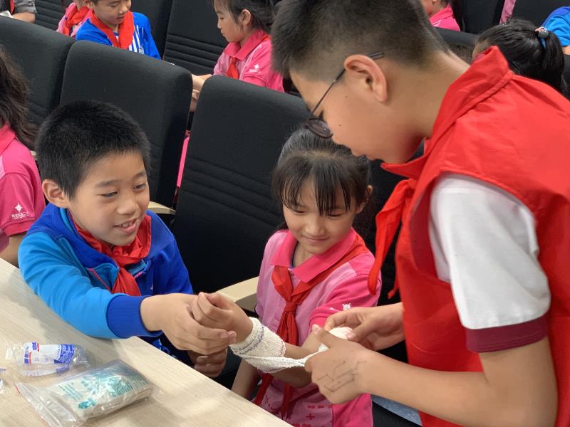 最后,我校李老师、丁老师和六位小红豆儿在“急救包扎实操演练”环节中,为小同学们用娴熟的手法完整展示了“螺旋包扎”和“大悬臂包扎”,引来小同学们一阵阵赞叹。老师为同学们发了绷带和三角巾,两人一组,六小红豆儿哥哥姐姐手把手耐心细致地指导着弟弟妹妹们,孩子们从一开始技术的不熟练,变得熟练,和哥哥姐姐们也从之前的陌生,变得相互熟悉,不停的举起小手展示自己的成果。由于时间有限,“大悬臂包扎”没能让孩子们继续练习,引起孩子们深深的遗憾,热切的期望哥哥姐姐们再来学校教授包扎技能。