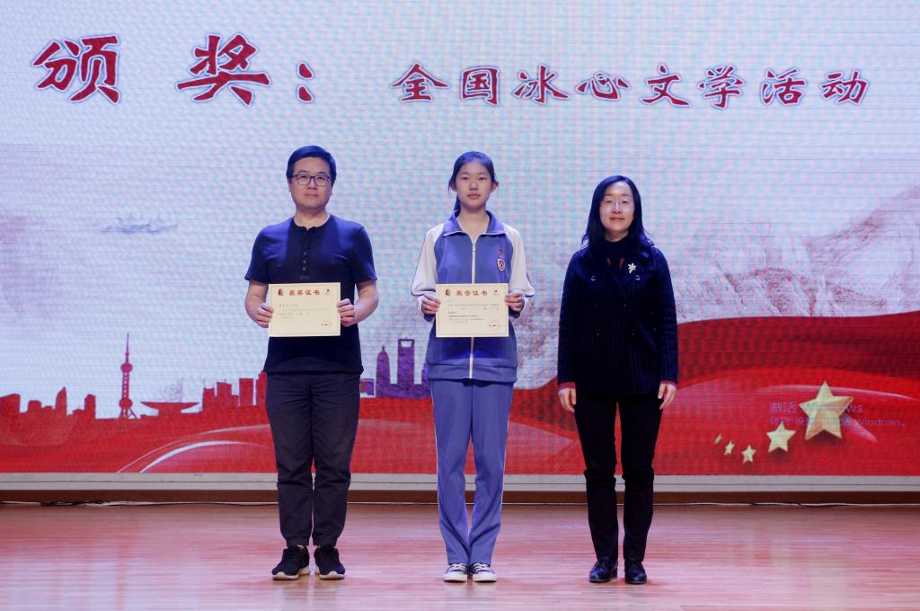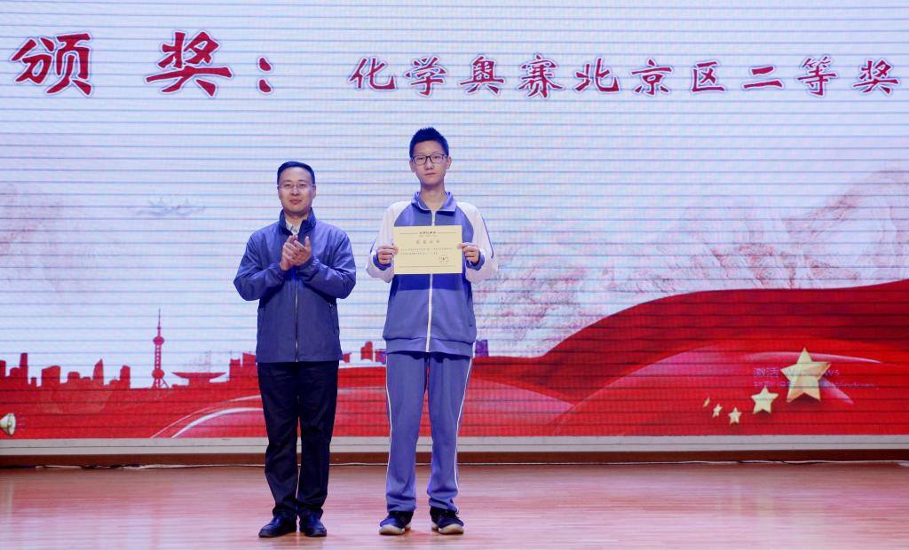在第十四届全国青少年冰心文学活动中,我校师生共23人荣获一等奖。在北京化学会2019年高中化学奥林匹克北京地区预选赛中,我校覃子祺同学等人荣获二等奖。我校教工团支部的各位青年团员立足本职、务实创新,展示出新时代青年教师的良好形象,荣获“海淀区五四红旗团支部”荣誉称号。我校副校长高雁鸣,校长助理、初中执行校长杨磊,校长助理、高中执行校长王静为获奖师生颁发证书。