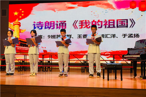 初二年级各班为大家带来了精彩的表演,初二(1)班至(9)班分别以朗诵、歌唱、乐器独奏或合奏等丰富的形式,完成了《我的中国心》、《祖国万岁》、《长江之歌》、《映山红》、《北京的金山上》等一出出精彩的表演。其中(1)班的《我的中国心》激昂澎湃,开篇便将全场的气氛带入了高潮。(2)班五人朗诵的《祖国万岁》整齐划一,声情并茂,朗诵到高潮时,表演者激昂的语气令同学们热血沸腾。(3)班的《长江之歌》舒缓深情,诉说着对祖国大好河山的无限赞美。(6)班的《我的祖国》悠扬中融合着激情,体现了对祖国深沉的挚爱。由(7)班同学带来的小提琴独奏《我的祖国》也十分引人,无论是前半段的委婉悠扬,还是后半段的激情澎湃,都被表演者深厚的功底以及小提琴极具穿透力的音域完美地演绎了出来。