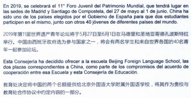 本届论坛以“遗产之路”为主题,邀请来自中国、英国、巴西、保加利亚、哥伦比亚、乌兹别克斯坦等10个国家以及西班牙各地区的共32名中学生参与。活动期间,各国学生将赴加利西亚大区参加遗产修复培训、遗产参观等一系列活动,并将亲自体验西著名世界遗产——“圣地亚哥”之路,徒步完成最后8公里路段的行程。来自我校的2名学生以及1名辅导老师应邀参加本届论坛。