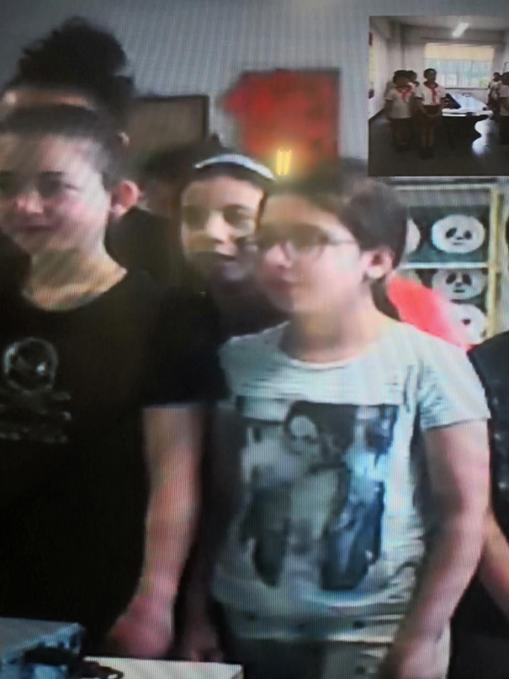 活动中,法方学生纷纷用中文做自我介绍,中方学生也用法语进行自我介绍。中法学生认真聆听对方的自我介绍,并不时报以热烈的掌声。法国学生非常认真的演唱了中国歌曲《虫儿飞》,我校学生也表演了法国经典歌曲《香榭丽舍大街》,最后两校学生用中文合唱儿歌《两只老虎》结束此次视频交流活动。