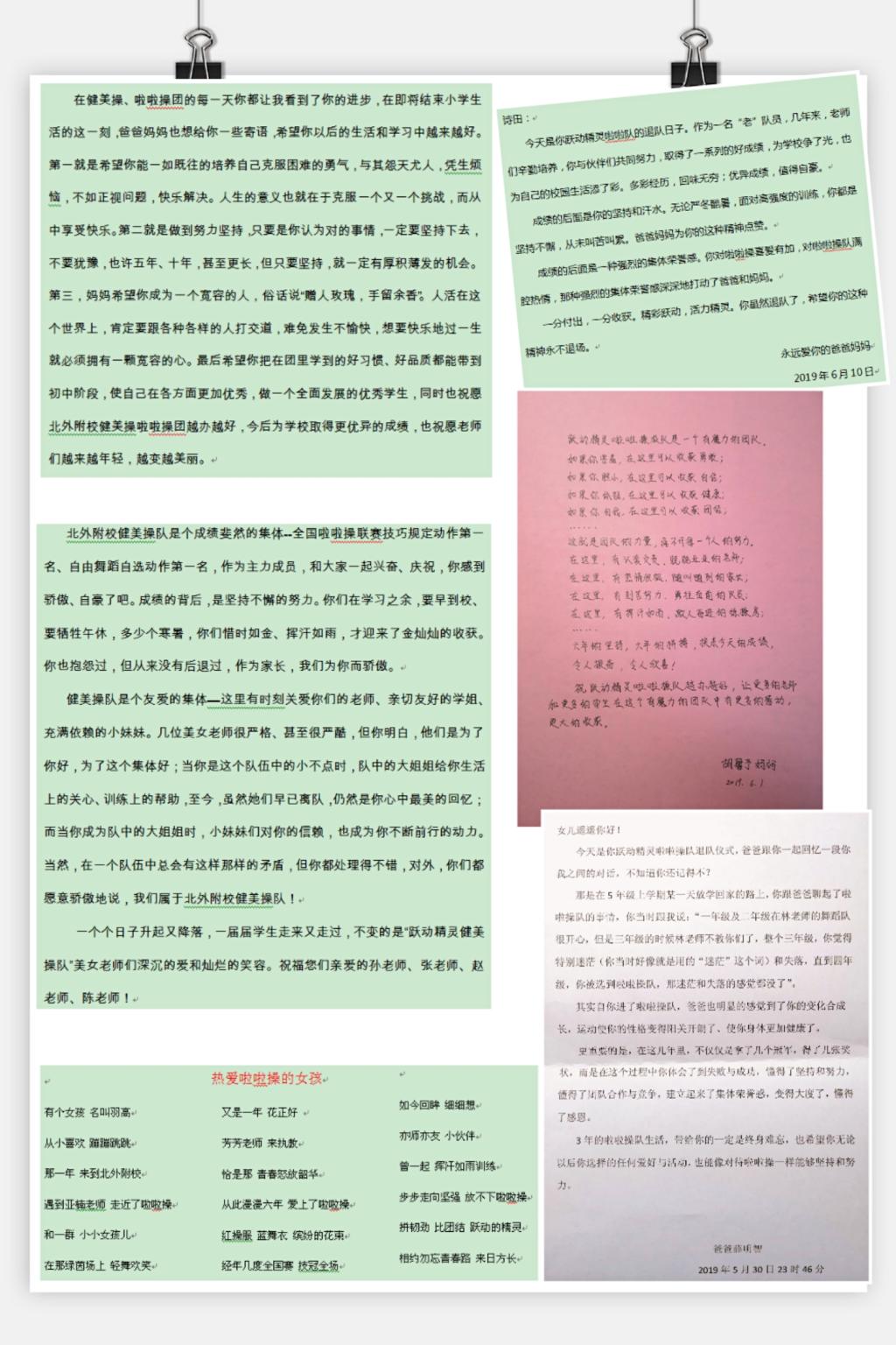 赵老师用提前准备好的大大“红包”“惊喜”送给孩子们。打开红包的那一刻,孩子们的情绪终于收不住了,因为那是爸爸妈妈们给自己最好的礼物。天琦爸妈在信中说:“天琦,你好,当你看到这封信的时候,你正在参加退团仪式。首先,我知道健美操、啦啦操校队对你的重要性,从每天回家做完功课的练功,到认真准备每一次比赛,爸爸妈妈都能看出你对这项运动的热爱。其次这个团队的凝聚力让我们每一个做家长的都很信服,能让孩子积极主动地完成每一项任务是非常不容易的一件事情,这既培养了孩子的自主能力,还能磨练他们的意志,让每一个孩子在身体和心灵方面都得到了成长,谢谢健美操、啦啦操校队的全体老师们。天琦你让我们看到了你勇敢、坚强、努力、担当的一面。印象最深的就是六年级有一次为了学校开放日,你需要表演一个高难度动作,训练时你把嘴唇磕破的那一刻,当接到老师打来的电话时,你不知道妈妈心里有多紧张,恨不得一瞬间就能赶到你身边,当我在学校见到你的那一刻,妈妈真的被你的坚强和勇敢感动到了,你还记得当时我问你是否害怕,还想继续参加训练的时候你的回答吗,你说:‘妈妈,我没事,我能克服,我要坚持训练,因为那个位置需要我,我必须上,这是团队的荣誉,不能让老师失望。’妈妈当时真的为你感到自豪。”