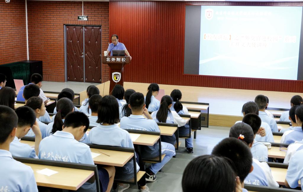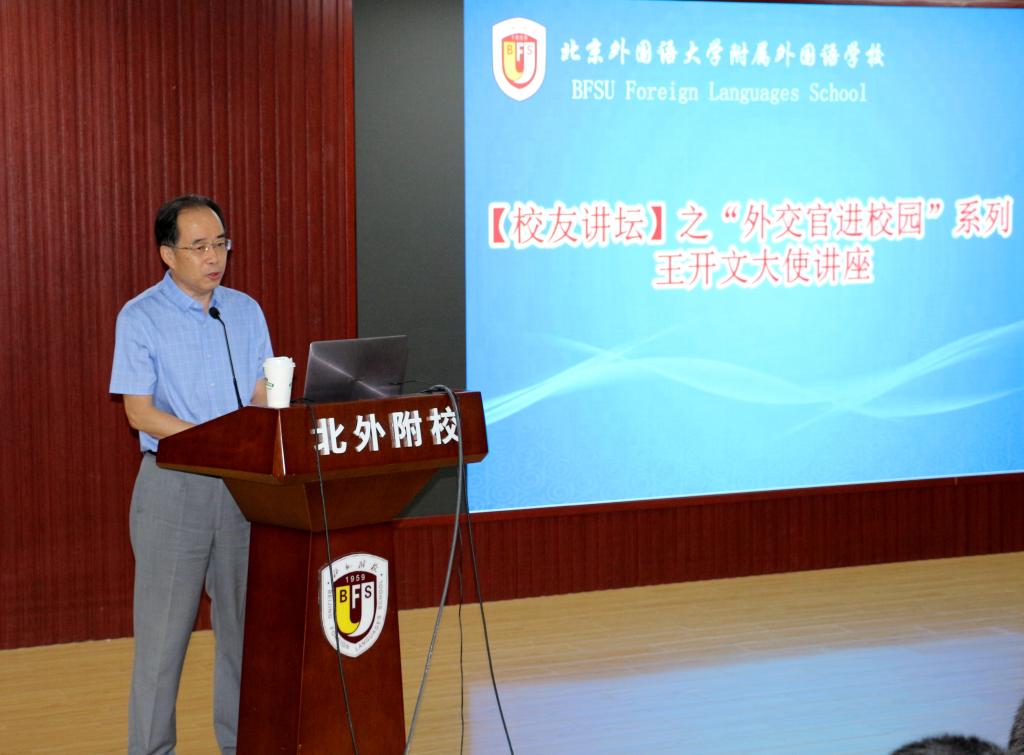 讲座中,王开文通过简述中俄建交70年的外交史,一方面介绍中国改革开放40年在政治、经济、金融、科技方面所取得的令人瞩目的成就,激发同学们的爱国之情和民族自豪感,另一方面提出因国家发展的需要,亟需大量的掌握流利外语并在某一领域有所专长的“复语复合型”人才,在国际舞台上占有一席之地,为祖国发声,提升我国的国际影响力。因此,他鼓励同学们打好外语基础,努力学习专业知识,将来用地道流利的外语向世界各国介绍中国理念和中国文化,让更多的国家和人民了解东方的哲学思想和行为方式,让世界人民了解中国喜爱中国。王开文还回忆了在附校学习俄语的时光,并分享了学好外语的经验之一就是要在实践中大量运用语言。
