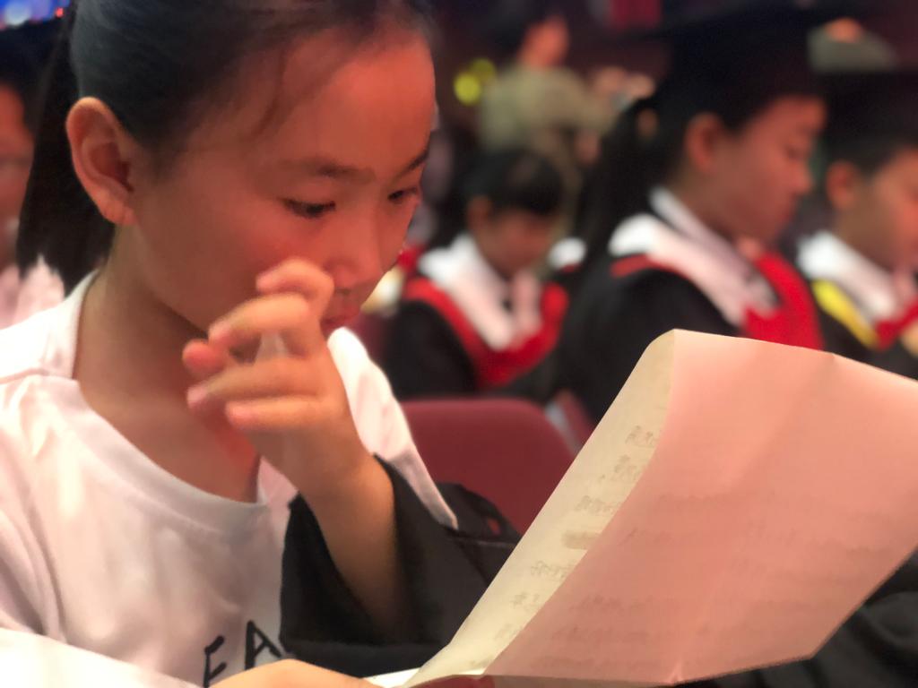 学弟学妹们也为毕业生合唱了一首《奉献》,在优美的旋律和歌声中,毕业生们怀着激动的心情兴奋地拆开了父母写给他们的信。信里字里行间都是父母语重心长的话语和饱含着的浓浓深情,孩子们读着读着不禁潸然泪下,场面充满温情与感动。六年级全体老师为毕业生送上了诗朗诵《讲台上的守望》,来表达对孩子们的不舍和期望。