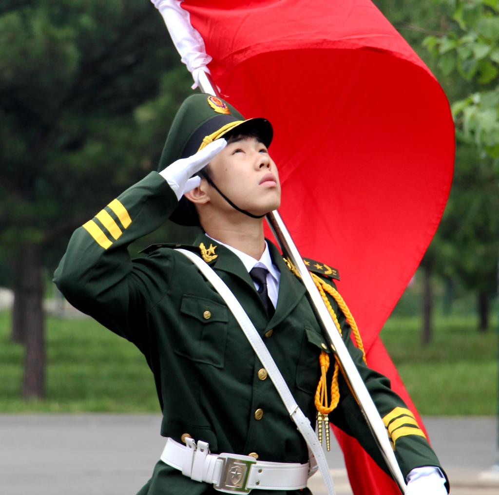国旗护卫队迈着整齐、有力的步伐,执行升旗任务,全体师生面向国旗行注目礼(队礼)。