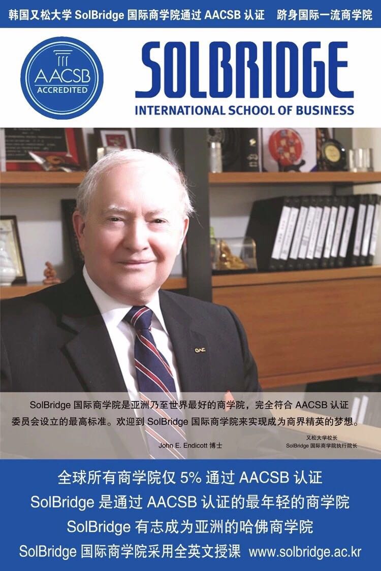韩国又松大学国际商学院(SOLBRIDGE International School of Business,简称Solbridge)成立于2007年,位于韩国大田广域市(Daejeon)。大田是韩国第五大城市,韩国的科技中心,被称为韩国硅谷。SolBridge国际商学院是又松大学重金打造的商学航母,商学院以其优质的教授资源、独特的教育理念,宽广的就业实习网络,高质量的学生素质名列韩国第一,它是一所专注于亚洲经济发展,旨在培养亚洲未来青年领袖、促进亚洲各国经济文化交流的新型商学院。SolBridge国际商学院获得了亚太商学院联合会(AAPBS),并且获得美国国际管理教育联合会AACSB的认证。