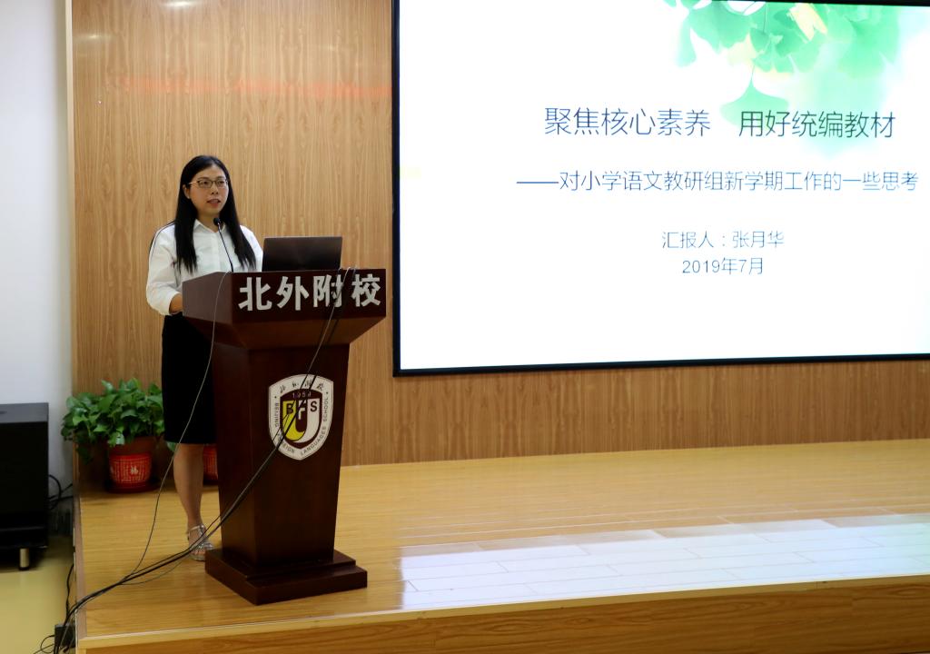 小学语文教研组长张月华发言主题为《聚焦核心素养 用好统编教材》,她就新学期工作,谈了自己的思考与构想。首先,语文组重点工作是用好统编教材,找准小学语文阅读教学的突破点:梳理统编教材编排体系,准确把握单元及课时教学目标;更新教学理念,以语文要素为导向,大胆取舍教学内容,继续推进单元整体教学研究,使语文核心素养落地。其次,依据测评指标,多项举措提升学生学业水平:设计《预学手册》,找准学生的起点;继续将《日有所诵》的诵读积累纳入过程性评价;继续开展整本书阅读教学研究,建立阅读激励机制,推进阅读工程建设。再次,借力区级课题,继续邀请崔峦和王化英老师进校指导语文教学工作,引领教研方向。最后,继续开展师生朗诵、校园作文赛、笔墨飘香等学科特色活动,以推进“五个一”工程。
