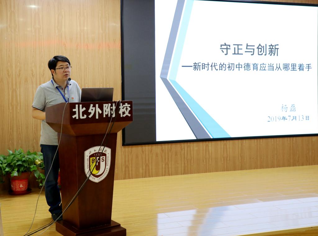 初中执行校长杨磊发言主题为《守正与创新》,以“新时代的初中德育应当从哪里着手”为话题,结合教育部2017年发布的《中小学德育工作指南》,国务院2019年6月印发的《关于深化教育教学改革全面提高义务教育质量的意见》等政策依据,剖析了“当下学校德育的病态症候”,指出了我校初中德育工作的主要薄弱点。杨磊还强调,有效的德育是活动的德育,是群体的德育,是基于实践的德育,要创新学校德育管理理念,遵循德育时效的原则。就我校初中德育工作主要薄弱点提出了几点改进措施:建立班干部、团干部、少先队干部花名册,并从中挑选值周干部,加强班级常规量化管理,做到每日公示,每周总结,每月分析;建立全面培训与专项培训相结合的学生干部培训模式,明确岗位职责与工作要求;落实班主任例会制度,从《班主任工作ABC》开始,进行全员培训,开展班主任沙龙,探讨班集体建设中的方法、措施和问题;优化班主任工作评价量规,进行多维度量化评价,并适时调整各评价指标的权重。