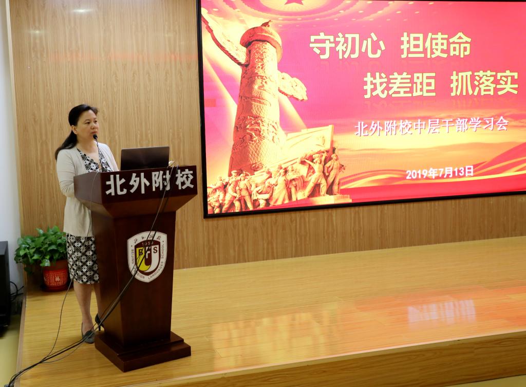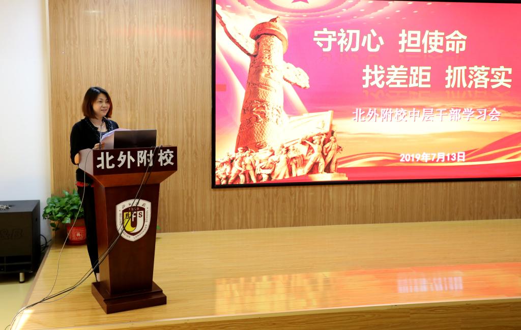 张继军做总结发言。她首先肯定了四位干部的发言,她指出,每位干部对自身工作都有明确的提升目标,对存在的问题有深刻的认识,问题找得准而深,并能够针对问题提出具体、务实的改进措施。张继军强调,全体党员干部要切实做到“守初心 担使命”,学生的发展、北外附校的发展是我们的初心,每位干部都要对自己分管的工作有明确的认识,认真寻找工作中存在的问题和差距,不断检视反思,并制定切实可行的措施,做到高标准,严要求。要狠抓工作落实,“一分布置,九分落实”,全体干部要率先垂范,不断加强自我学习和同伴研究,提升自己的专业化水平和管理能力。要以新学期的计划为切入口,厘清工作重点和难点,将工作做实做细做好,促进学校教育教学工作的全面提升。