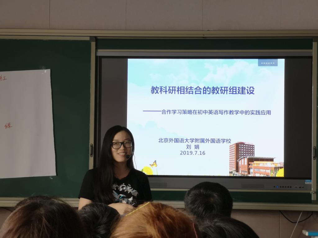 得知参加此次培训的主要是青龙县各校的英语教研组长或骨干教师,第二天刘娟老师的讲座首先从教研组建设和英语学科建设的角度,结合自身教研组长的工作经验,跟大家分享了教师专业成长和学生学业进步的发展途径。她倡导教研要向科研转型,并以我校英语组刚刚结题的海淀区“十三五”课题之一《合作学习在初中英语写作教学中的实践研究》为例,向老师们展示了科研与教研相结合在教学实践中的应用。她同时提出英语教学要落实核心素养;提倡读写结合,同时倡导学生自评和互评,并毫无保留地跟大家分享了我校师生使用的许多英语评价工具。刘老师的讲座通俗易懂又有很强的指导意义。