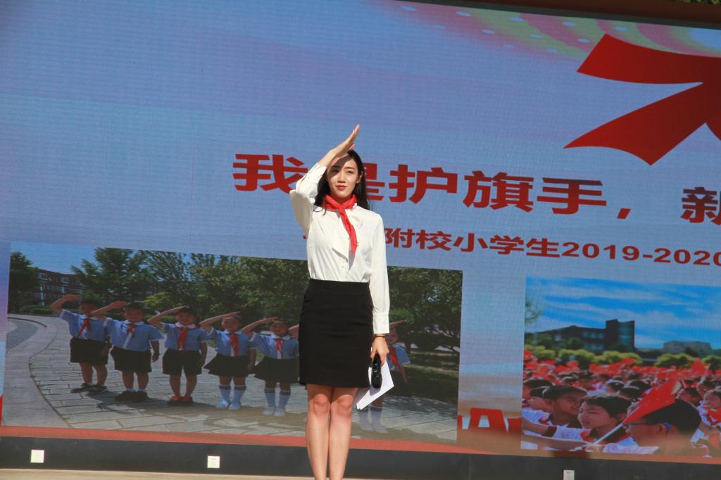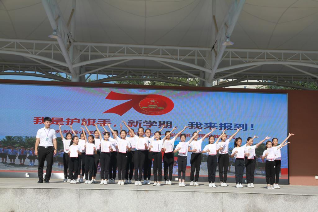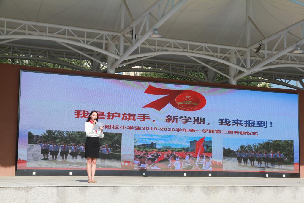 9月2日上午,我校小学举行2019-2020学年第二周“我是护旗手,新学期,我来报道”主题升旗仪式。全体小学师生参加了新学期的升旗仪式。