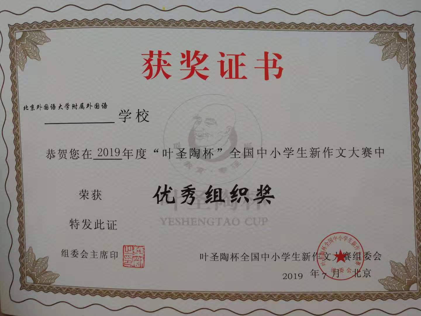 我校小学生在第 27 届“叶圣陶杯”全国中小学生新作文大赛中喜获佳绩。其中,张泽宇、贾芳晨、于知微、张中阳4名同学荣获一等奖;孙月兮、李明儒等15名同学荣获二等奖;王晨曦、夏佑凯等25名同学荣获三等奖。张月华、杨寒雨、李秋实、李晓卉4位老师荣获优秀指导教师奖。北外附校荣获“优秀组织奖”。