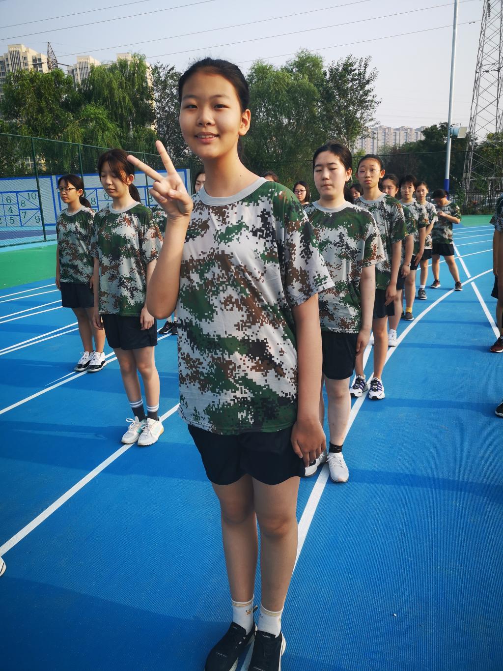 @高一(1)班陆姿含:我们去集合的时候喊的口号是全年级最大声的,连班主任和校长都惊呆了,教官们对我们竖起了大拇指。