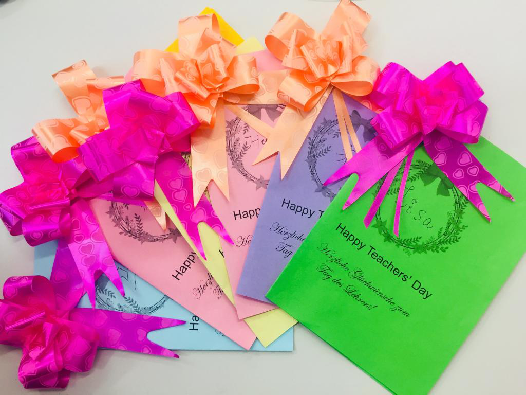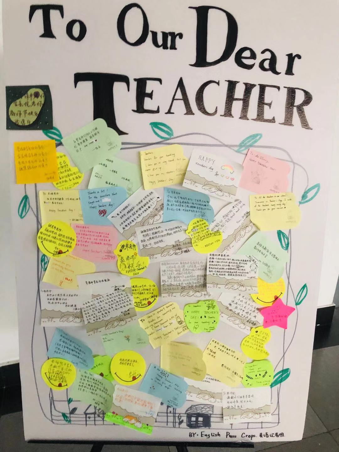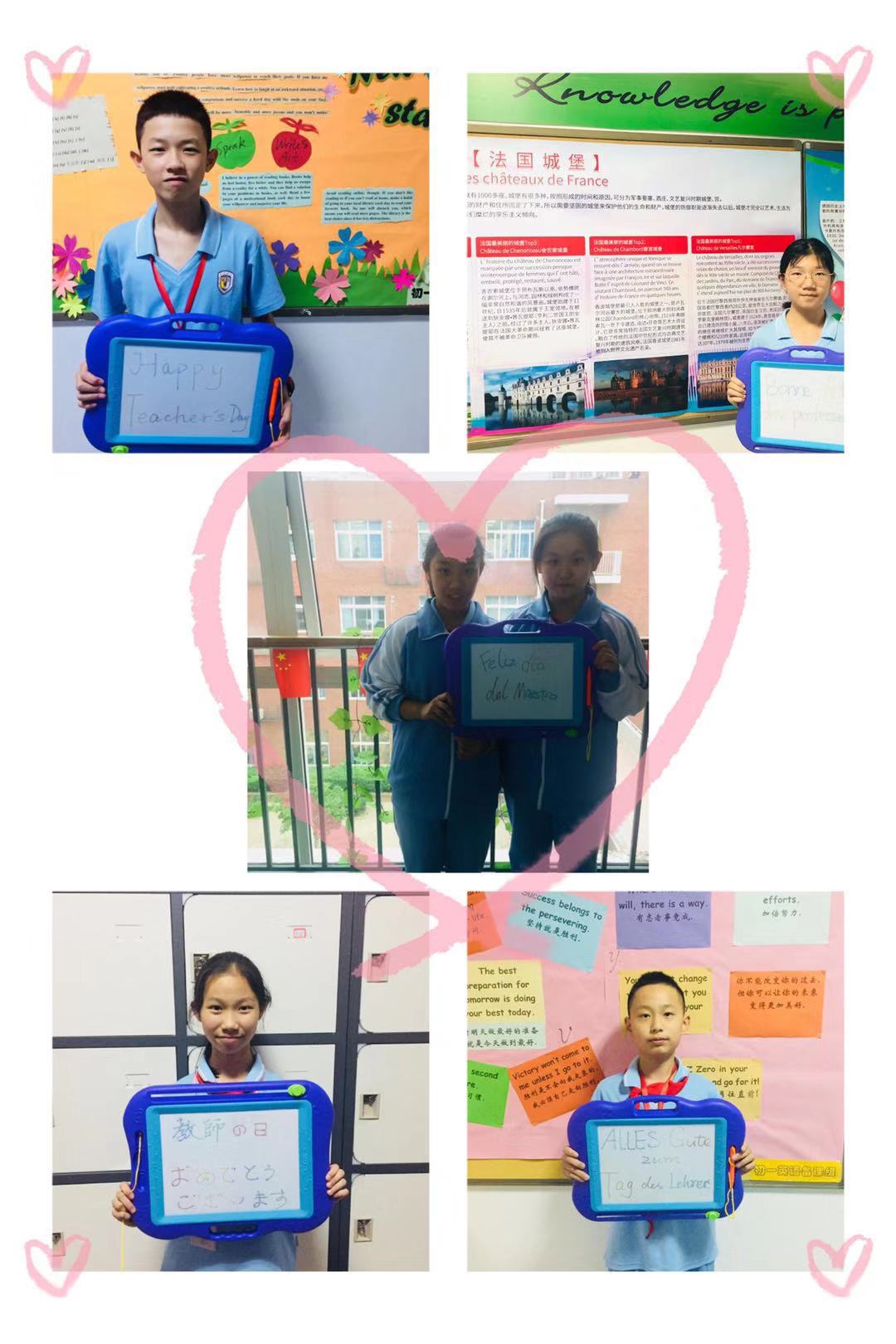 英语特长班、德英复语班、西英复语班、法英复语班和日英复语班的同学们还创作了可爱的“祝福板”,分别用英语、德语、西班牙语、法语以及日语五种语言致谢恩师。