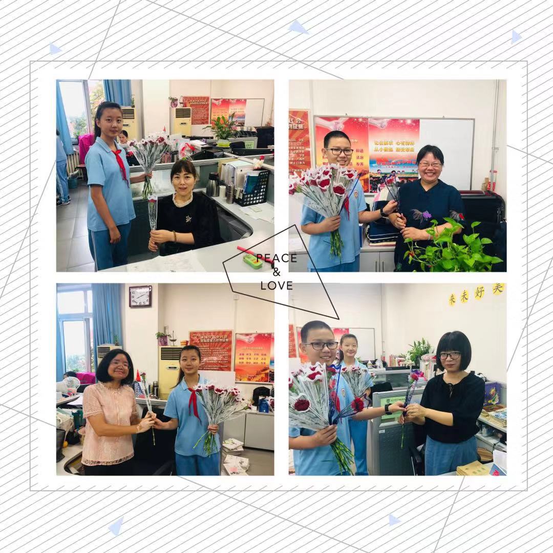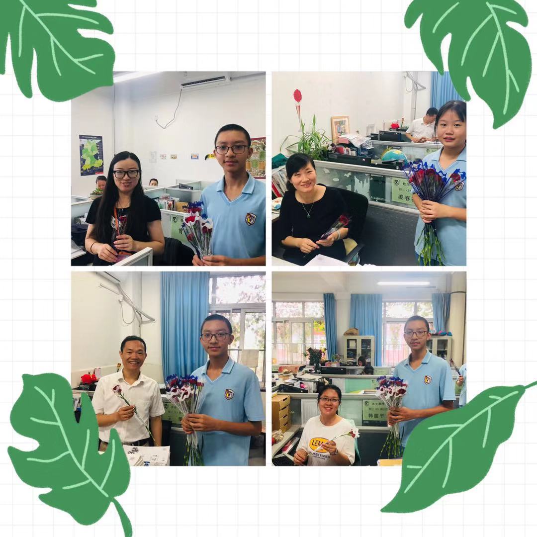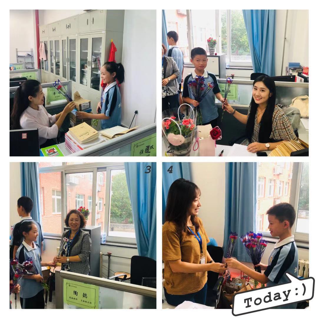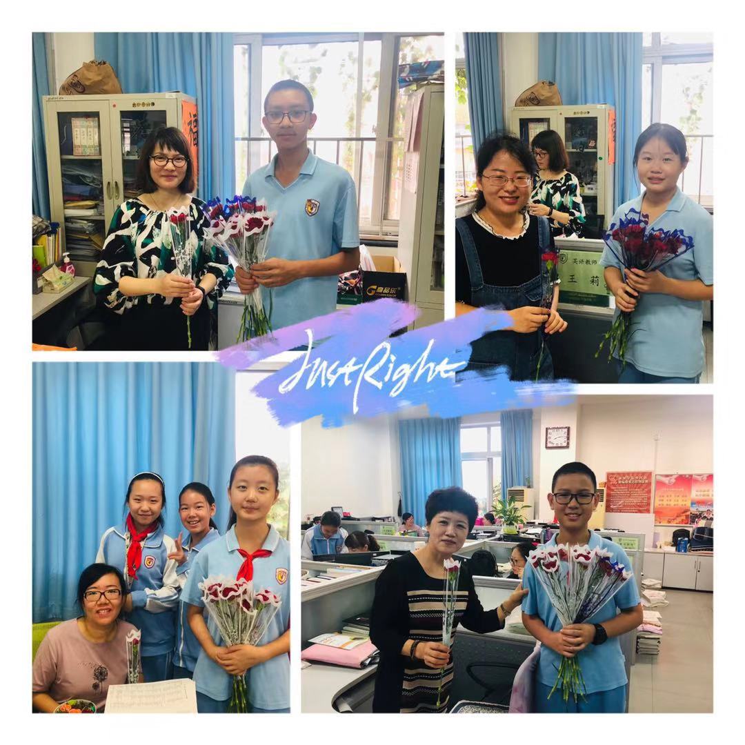 清晨,伴着嘤嘤鸟鸣,初一年级的孩子们早早到校,抵达班级布置教室,“祝老师节日快乐!”遒劲的黑板字映入眼帘,美感十足,令人称赞。有的孩子悄悄地从书包里拿出写给老师的贺卡,小心翼翼地抚摸着,一遍又一遍,生怕自己弄皱了。有的孩子手捧鲜花,攥在手里反复嗅着,随时准备给老师一个“惊喜”。“铃铃铃”,上课的时间到了,同学们早已经在座位上坐好等待着老师的到来。老师刚站到讲台上,微笑的面对同学们, “老师节日快乐,您辛苦了!”,只听见同学们整齐划一的声音响彻整个楼道。课代表同学为老师献上了精美的贺卡和鲜花,还宣读了别具学科特色的 “颁奖词”,同学们诚挚的向老师鞠躬致谢,而老师们脸上的微笑已然说明此刻内心的幸福与喜悦。此外,同学们还利用课间的时间走进办公室向老师们献上节日的祝福。学校处处洋溢着“谢师、爱师、尊师”的气息。
