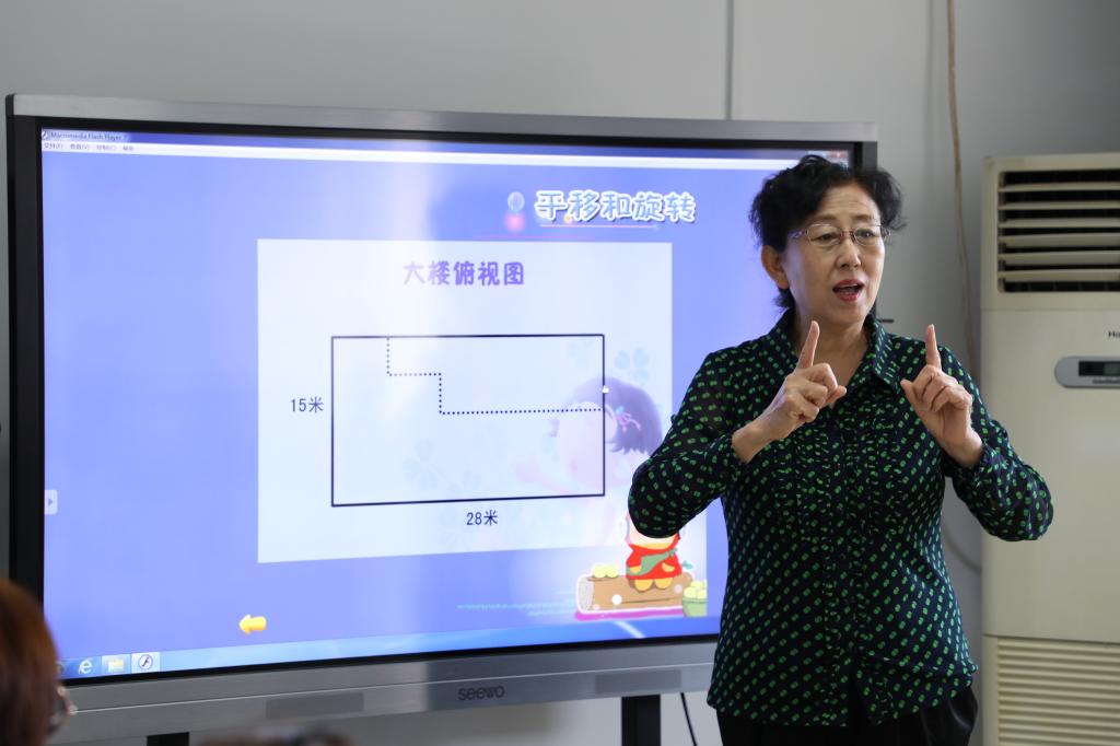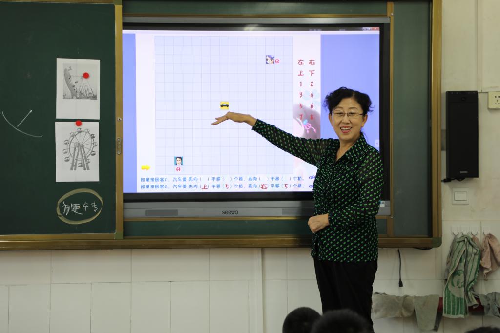 吴老师先来到三(10)班,给大家带来一节图形与几何领域的《平移与旋转》一课。吴老师通过观看游乐场中的活动场面,生动、直观地感悟平移和旋转,设计了动作表现、移动可同人物和学做小小调度员三个活动来感悟平移和旋转的特点,并充分调动多种感官参与,在探究中建构空间观念。最后,吴老师回归生活,在应用中体会平移和旋转的作用。在吴老师的课堂里,孩子们发自内心地体会到学数学的乐趣、应用价值和神奇力量。