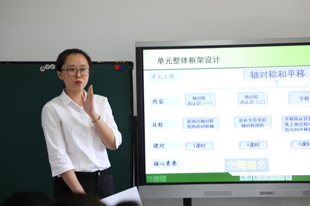 之后,大家聆听了五年级王晓晨老师带来主题为实践中丰富思维经验,循序建构空间观念的《平移》说课。王老师生活中平移现象实例出发,唤起对图形平移的生活经验和原有认知。通过设计多层次的动手操作活动探究平移的画法和平移运动的特征,理解并掌握将图形的平移转化为点的平移的思想,丰富学生的思维经验。最后将平移运动转化为平移方法应用于生活实际问题,拓展和提升学生的思维,积累平移运动的思维经验,发展学生的空间观念。
