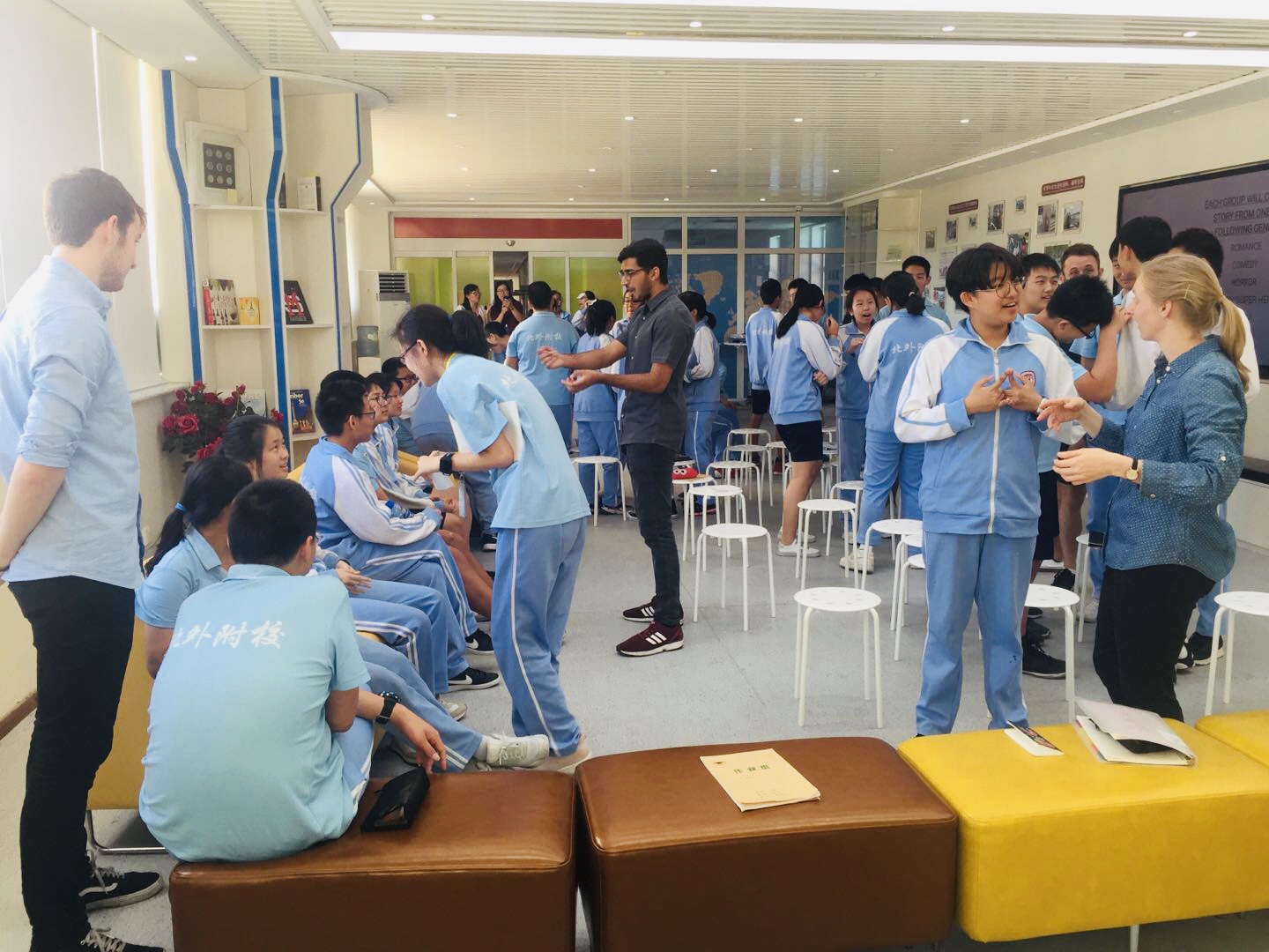 在热身环节,Mr. Z组织学生进行story train的口语练习活动,选出十个同学到前面轮流说一个单词,组成故事,Mr Amar也参与到活动中和同学们互动,帮助大家迅速地融入英语交流环境中。