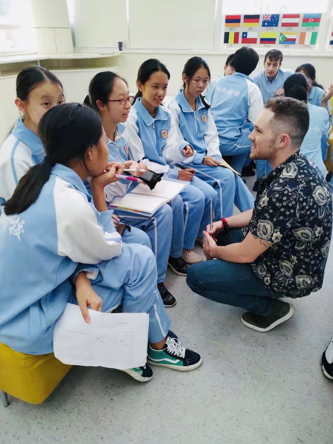 接着Mr. Z让同学们自由结成2-5人的小组,并布置了小组任务:表演一个小故事,以小组为单位进行展示。接到任务的同学们积极、认真地筹划自己的表演,在准备过程中,教师们也融入了学生们的小组讨论中,帮助他们扩宽思路、辅导学生用英语进行表达,鼓励不同层次的学生进行相应的语言能力表达,与同学们共同创作“剧本”。