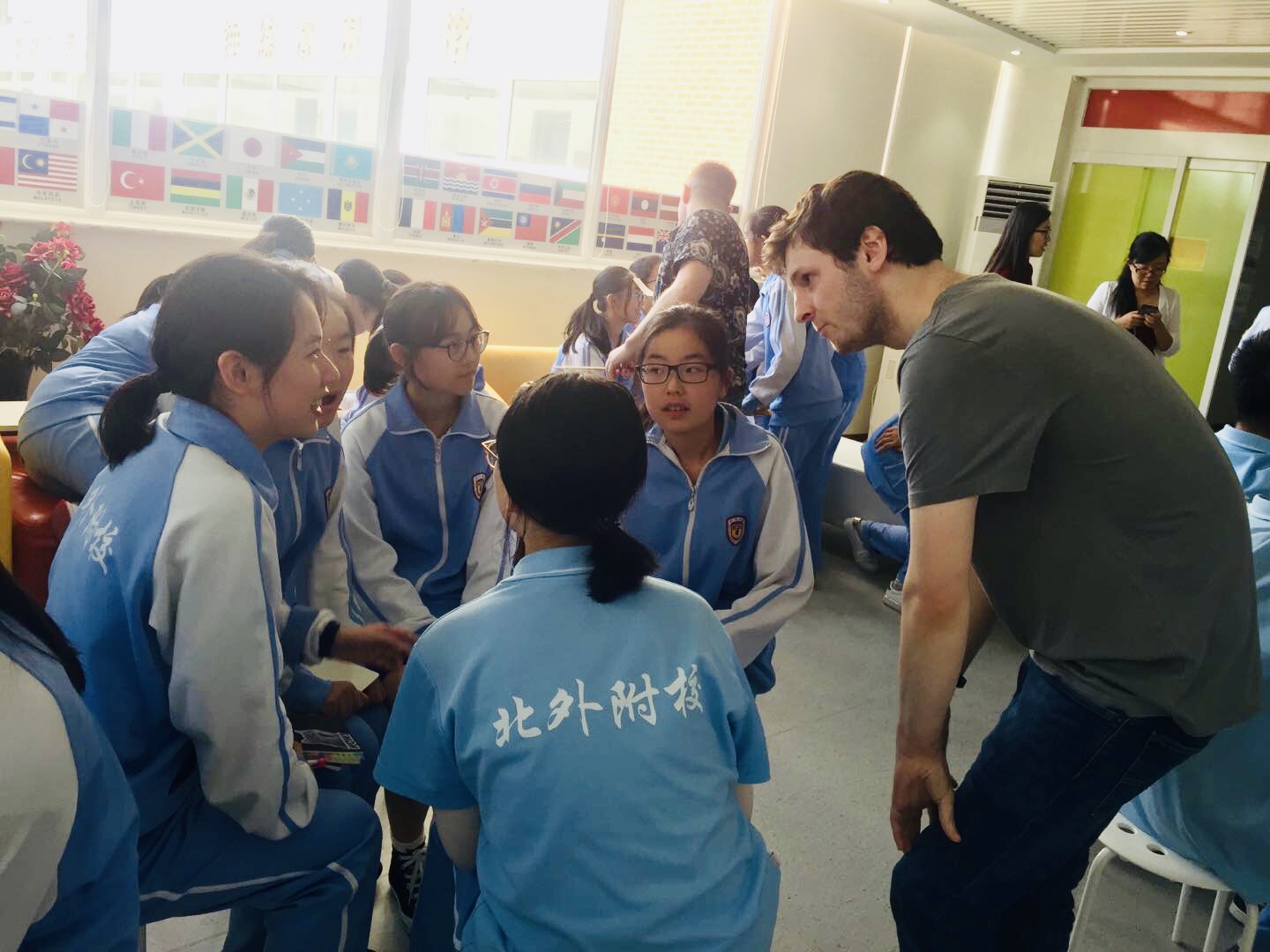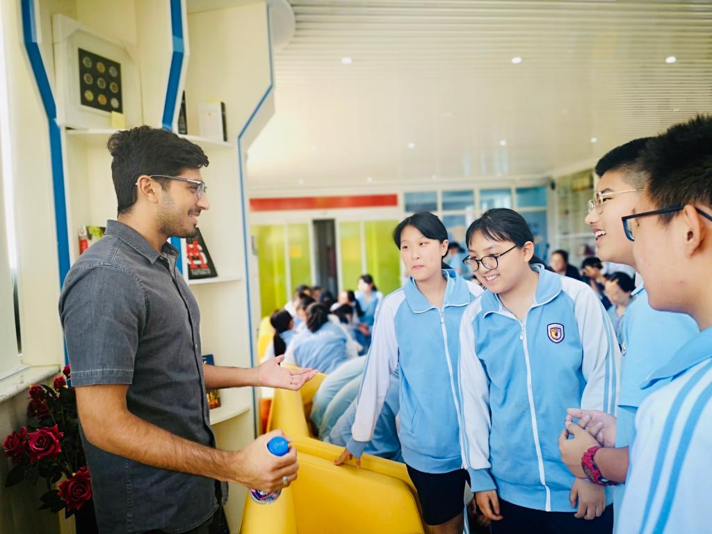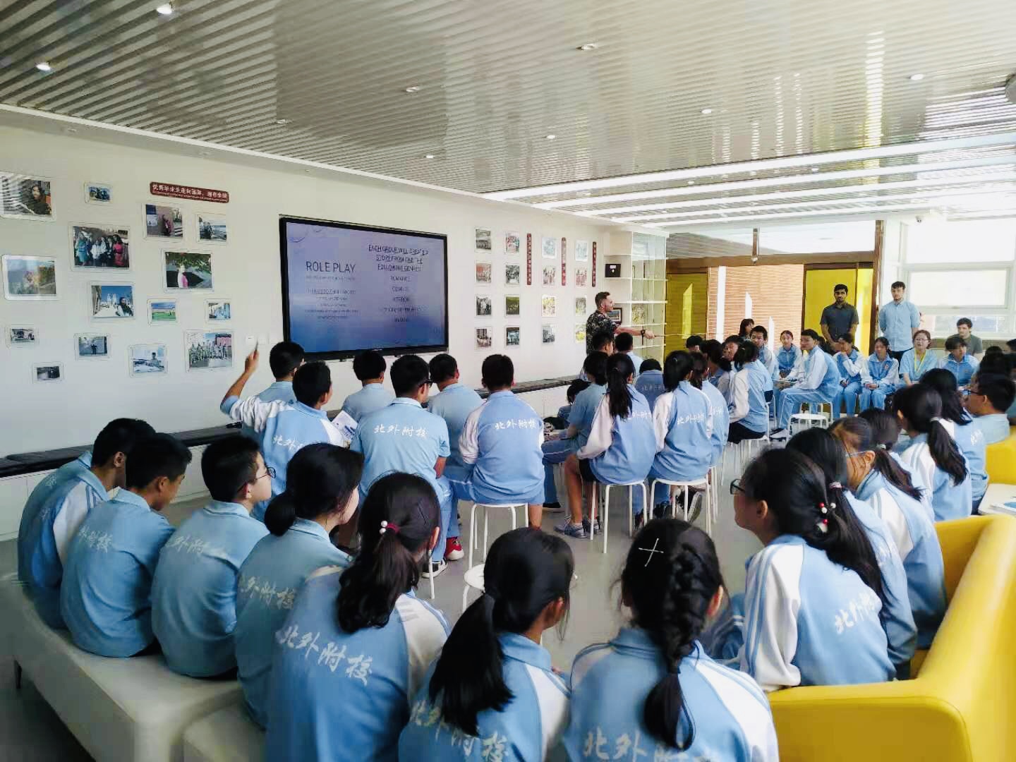 9月18日中午,初中高端英语项目第一次英语角活动在宽敞、明亮的国际展厅举行。本次“英语角”活动由外籍教师 Mr. Z策划并主持。初中国际项目外籍教师Miss Emily、Mr Amar、Mr. Adam、Mr. Harris以及初二和初三全体高端英语课程特色班学生参加了本次活动。