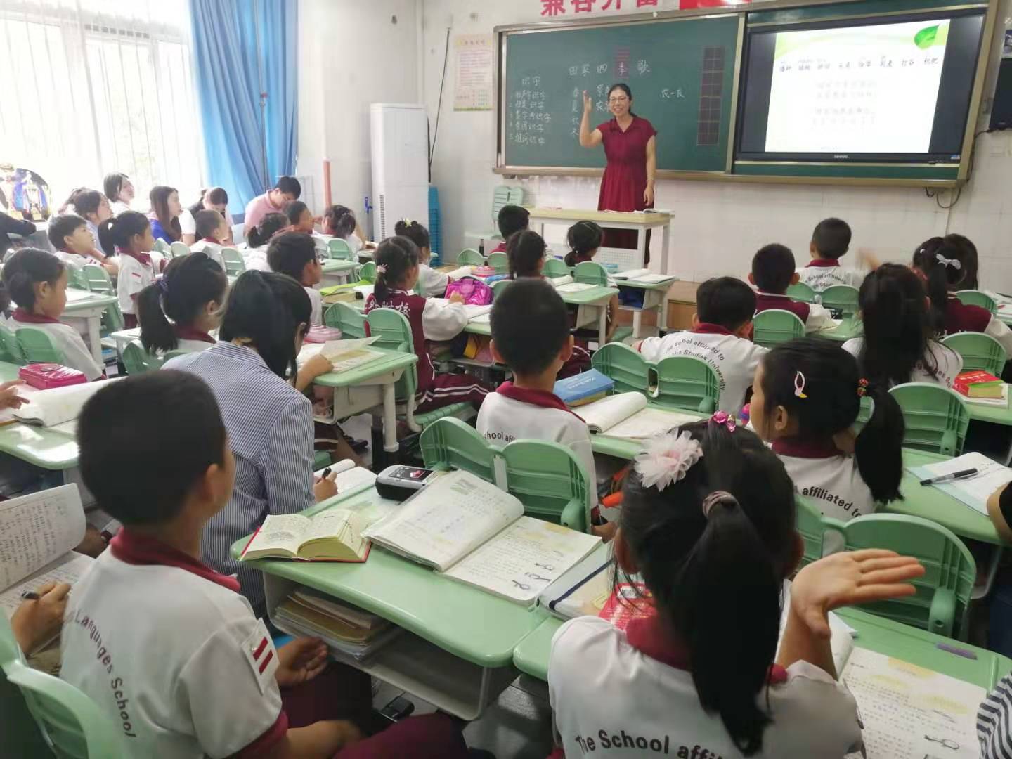 教研组长、党员教师张月华老师执教二年级识字单元的《田家四季歌》一课。课堂上张老师通过读儿歌猜季节激趣导入,教学重点在识字写字上,鼓励学生运用已经掌握的多种识字方法自主识字,把识字、写字与朗读指导有机结合起来。