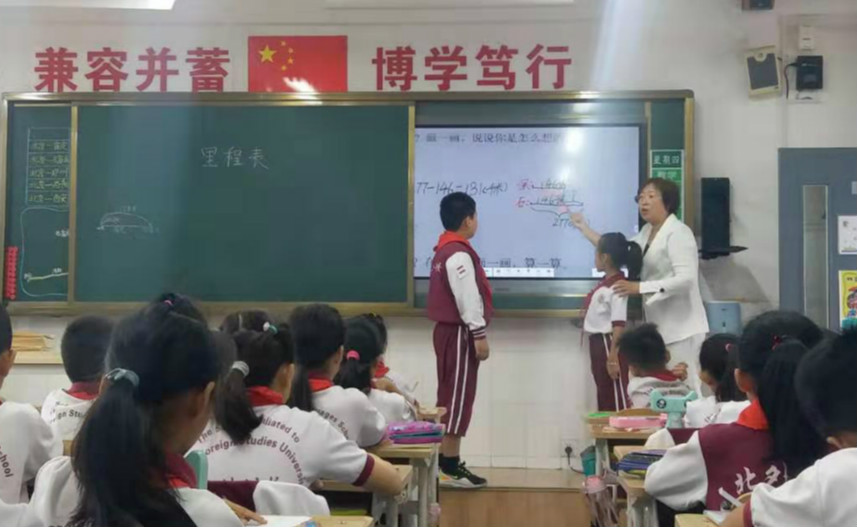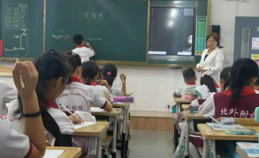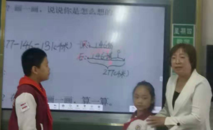 2019年9月19日,第一节课,张丽萍老师在三(1)班讲的数学课里程表(一)。伴随着优美的上课铃声,看着张老师和蔼可亲地走进教室,听着孩子们响亮地说着“一、二、三坐端正”。看!同学们精神多么饱满,坐姿多么端正,小手举得高高的,争先恐后地回答着老师的每一个问题。”因里程表不好理解,在这节课开始时,张老师采取情境的方式导入,帮助孩子学看里程表,并把里程表和铁路图结合起来引导学生理解。如:“保安到石家庄有多少千米?”从里程表中看出北京到石家庄有277千米,北京到保定有146千米(让学生在铁路图中找出相应的部分)。由于这幅铁路图起到了线段图的作用,此指导学生画出线段图来理解,引导他们从图中看出,用“277-146”能计算出“保定到石家庄有多少千米?”在其他环节教学中更加放手一些,张老师用鞭策、激励、赏识,等手段让学生体验成功的快乐,展示自我,从而获得自信和成功感,促进了学生的发展。特别在引导他们观察图、寻找数学信息时,让学生多观察、给他们充分思考的时间,评价语言的多元化,从而激励他们的学习热情,轻松突破了本节课的难点。