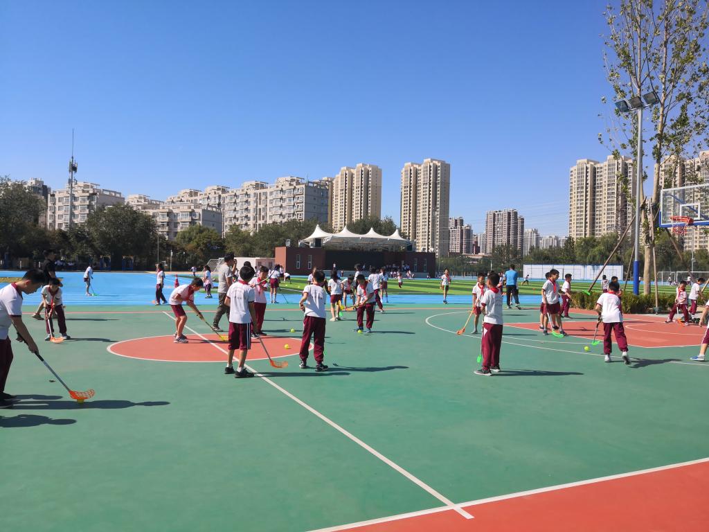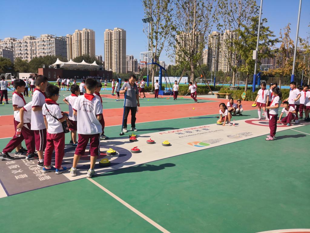 在教练指导下,四至六年级年级部分队员分组进行陆地冰壶项目体验和旱地冰球项目体验,让学生过教练讲解和亲身体验,了解冰壶项目和冰球项目。