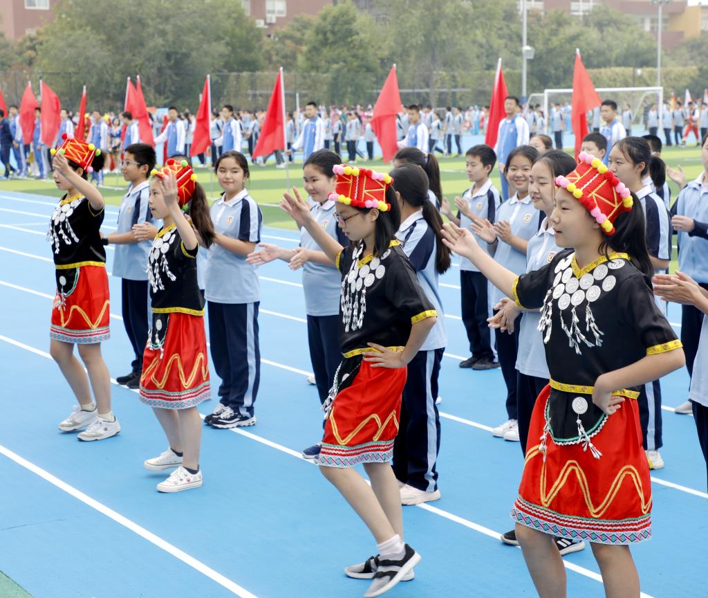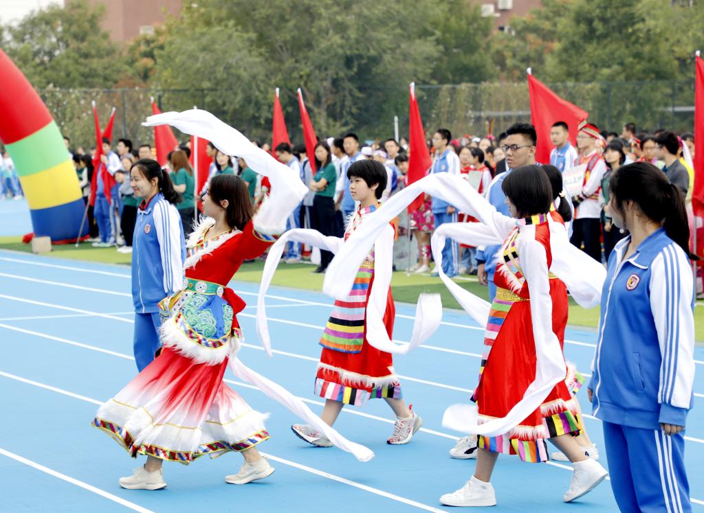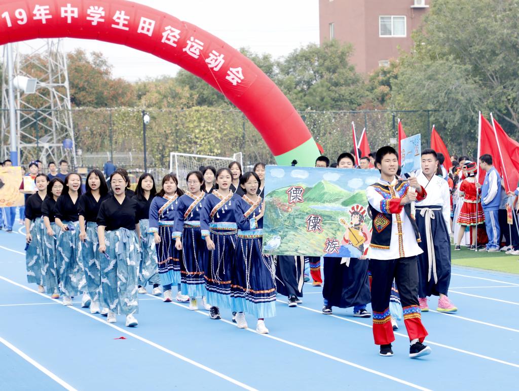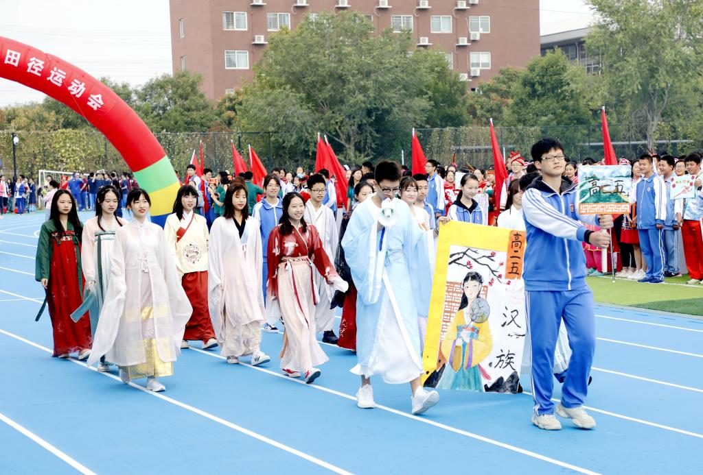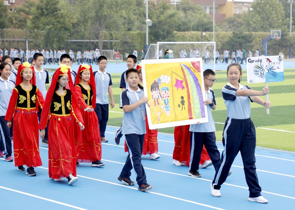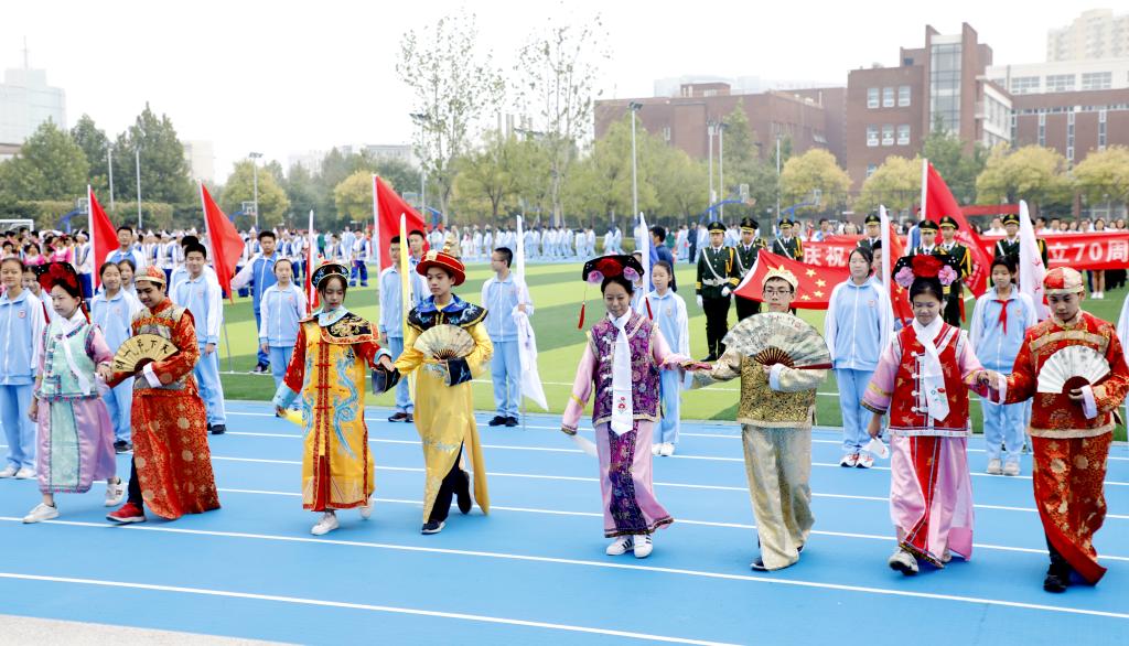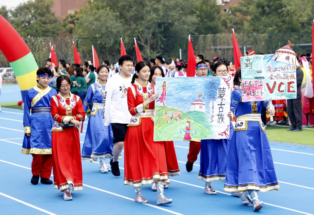 伴随着铿锵有力的运动员进行曲,国旗方阵首先入场。该方阵由国旗队、校旗队和彩旗队组成,他们踏着整齐的步伐,为运动会入场式揭开了序幕。初高中教师代表组成教师方阵,他们手中挥舞着一面面小国旗,用响亮的口号和饱满的精神状态向国庆和校庆献礼致敬。紧随其后的是班级代表方队,恰同学少年,逞飒爽英姿。每个班级在旗手的带领下,依次走过看台,洋溢着青春与活力,展现着自信与斗志。各班方阵入场表演是今年开幕式的一大亮点,每个班分别代表我国的一个少数民族,同学们身着特色民族服装,用他们的才艺、智慧和创意对各个民族的文化、体育、风土人情等特色做了生动的展示,带来一场华丽的视觉盛宴。