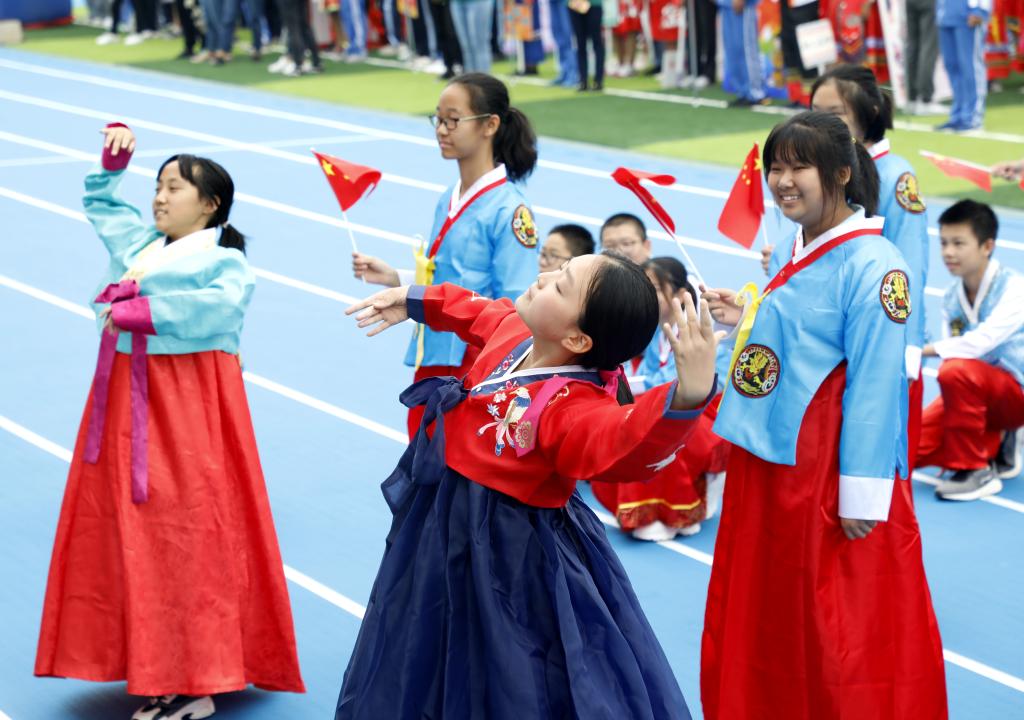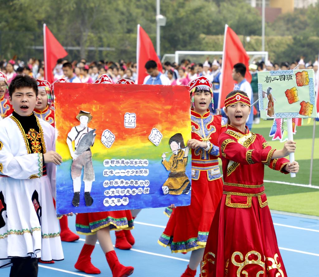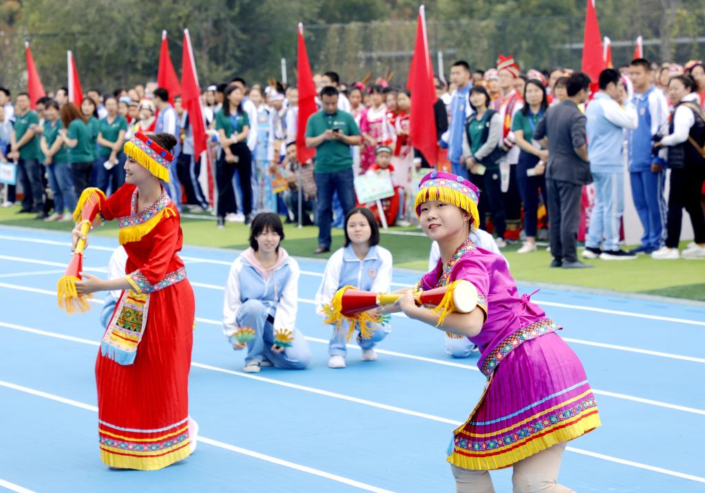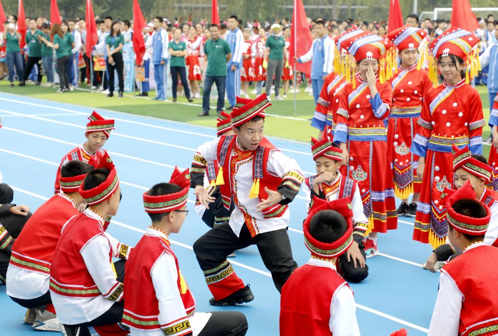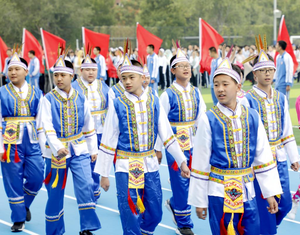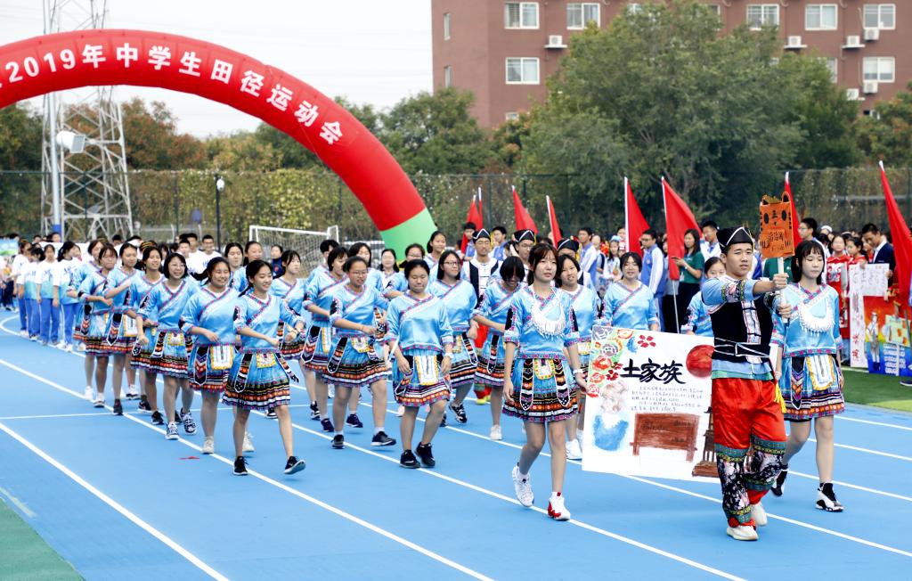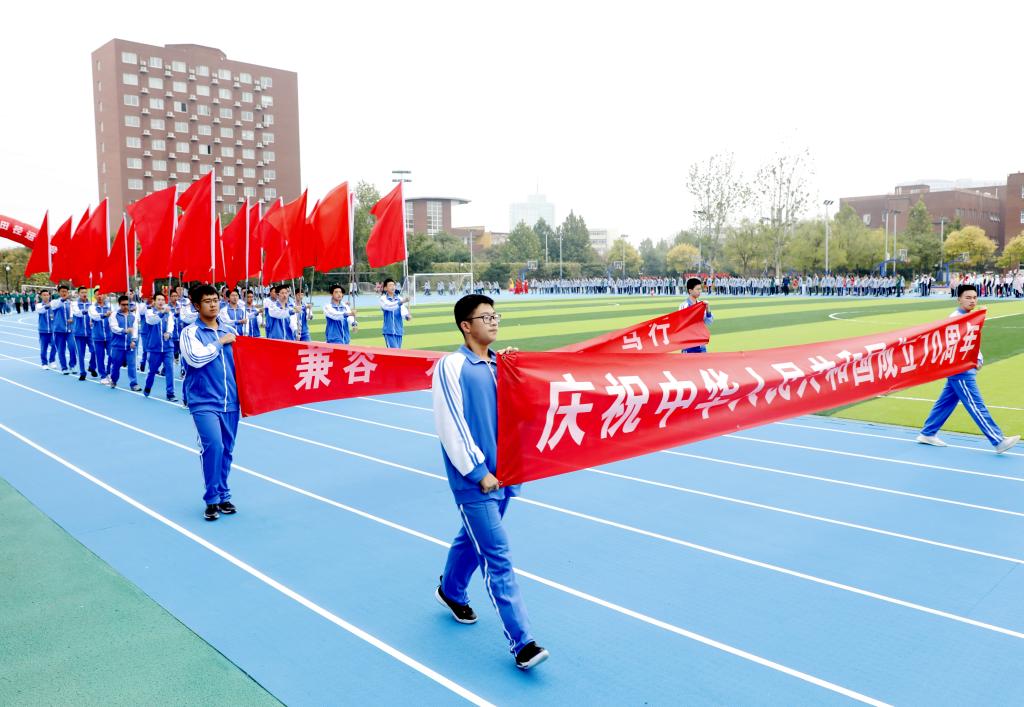 伴随着铿锵有力的运动员进行曲,国旗方阵首先入场。该方阵由国旗队、校旗队和彩旗队组成,他们踏着整齐的步伐,为运动会入场式揭开了序幕。初高中教师代表组成教师方阵,他们手中挥舞着一面面小国旗,用响亮的口号和饱满的精神状态向国庆和校庆献礼致敬。紧随其后的是班级代表方队,恰同学少年,逞飒爽英姿。每个班级在旗手的带领下,依次走过看台,洋溢着青春与活力,展现着自信与斗志。各班方阵入场表演是今年开幕式的一大亮点,每个班分别代表我国的一个少数民族,同学们身着特色民族服装,用他们的才艺、智慧和创意对各个民族的文化、体育、风土人情等特色做了生动的展示,带来一场华丽的视觉盛宴。
