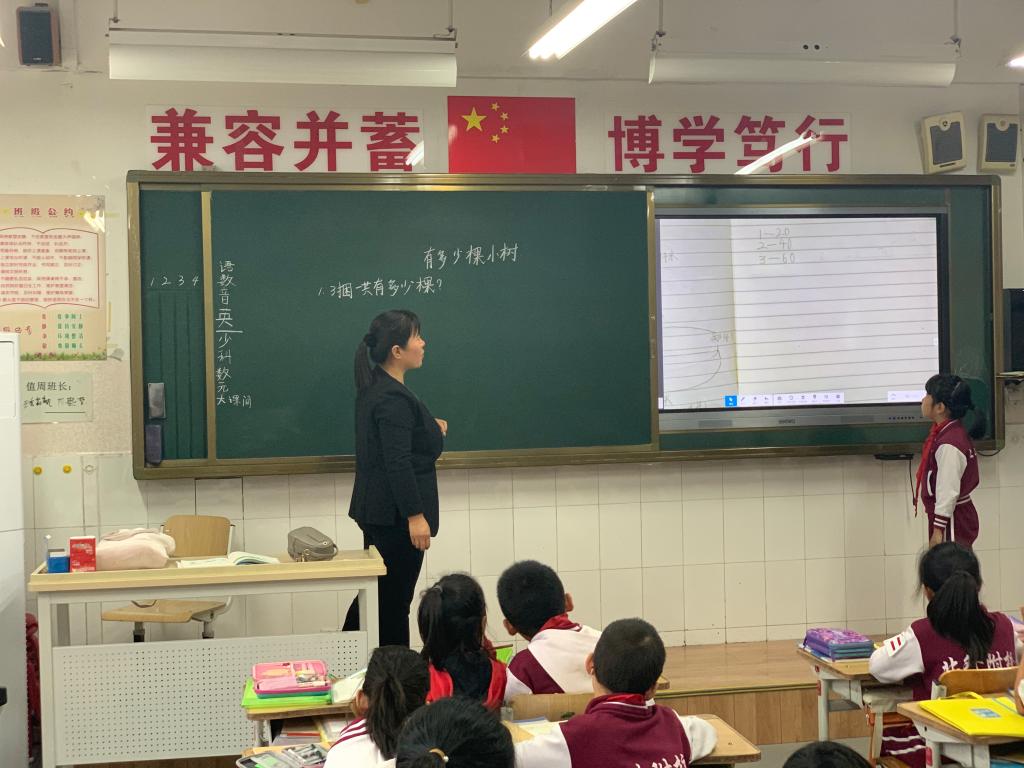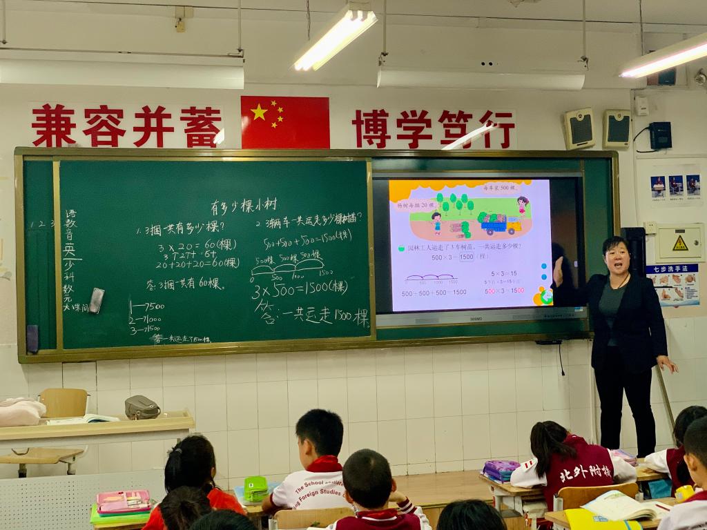 10月11日上午,小学部三年级数学朱万苓老师在三(7)班讲解了《小树有多少棵》——整十、整百、整千数乘一位数的口算乘法,与学生们再次研究乘法的奥秘。数学教师们进入了班级听课学习。