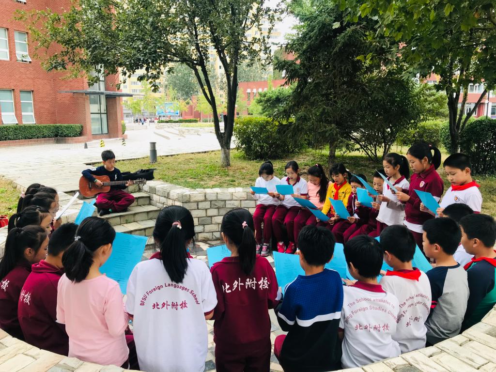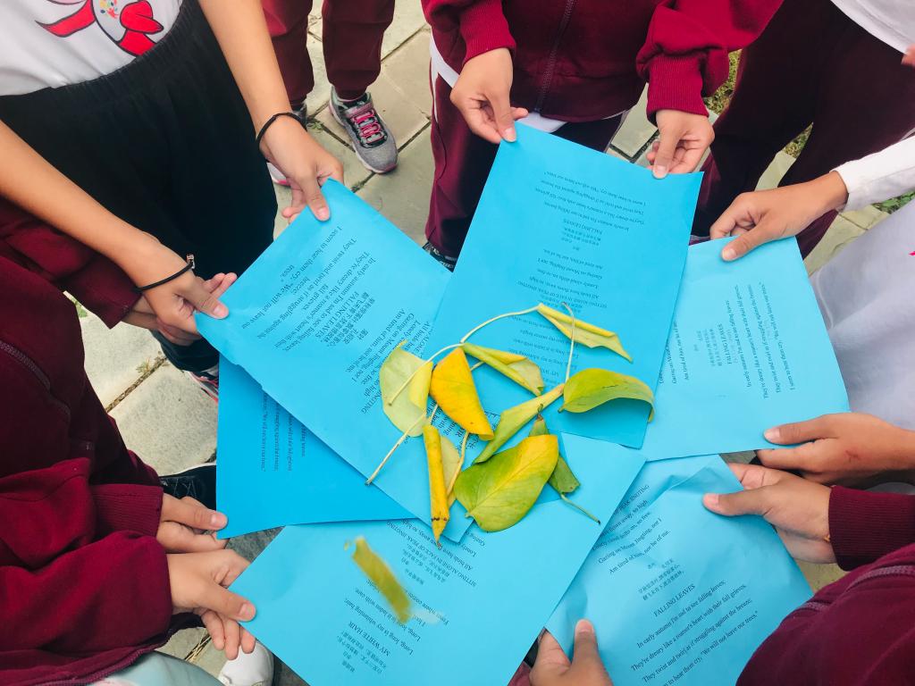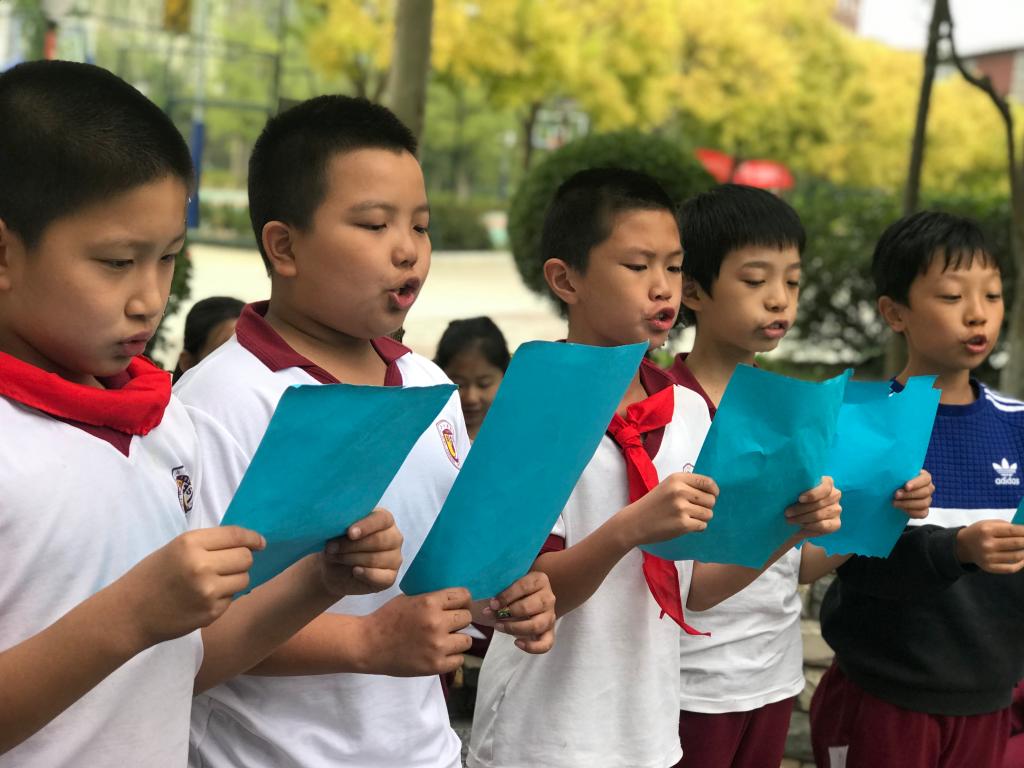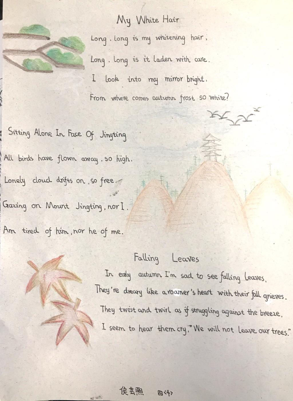 小学四年级于十月11日和12日进行了英语阅读日活动。本次活动主题为“Autumn Whispers”(秋日私语)。活动内容选取关于秋天主题的三首中英文唐诗。深秋将至,落叶飘零,在唐诗中体味秋的韵味,感受中英文化的交融,在秋的校园里我们用英语表达中国唐诗的感情。学生们拿着各色彩纸打印的唐诗,他们有的来到学校花园或者操场一隅欣赏秋天的美景,有的来到田园牧场与可爱的小羊驼分享秋的喜悦。他们围坐在一起,伴着吉他的美妙音乐,集体朗诵着《秋浦》《独坐敬亭山》和《落叶》三首唐诗;他们结对互相悄声朗读,将秋天的惆怅化成同伴间的私语;他们争相进行展示表演,真正地爱上了阅读。通过此次有趣的情景阅读,小朋友对中国唐诗产生兴趣,从而使学生主动渴望去了解唐诗、热爱中国文化,并能在此情景中自发进行唐诗的朗读,建立了民族自信,既陶冶了情操又提升了英语语言水平。