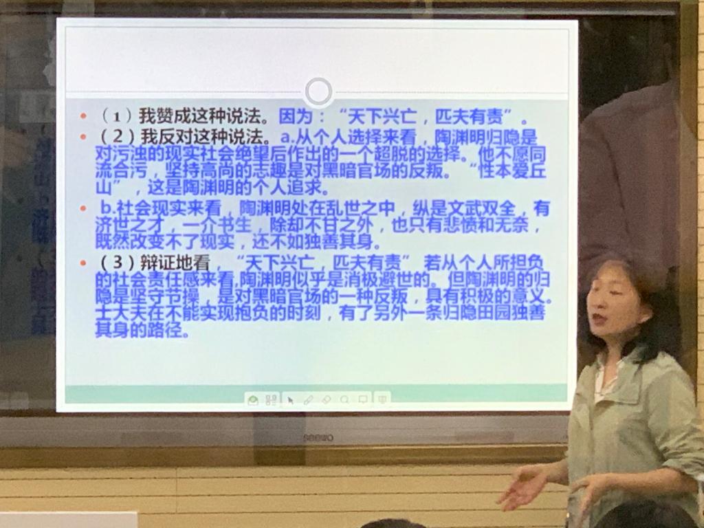 10月10日,我校高中校区高一年级语文老师赵璐在录课室上了一节《归园田居》公开课,全体语文老师、教务处领导及部分其他学科教师前去听了课。