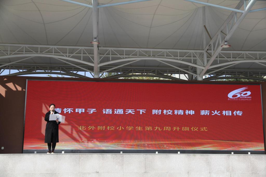 10月22日,我校小学举行“情怀甲子语通天下,附校精神薪火相传”主题升旗仪式。北外附校副校长于苒,小学执行校长刘宏利,副校长李琳、孟娜、孙亚楠出席本次升旗。