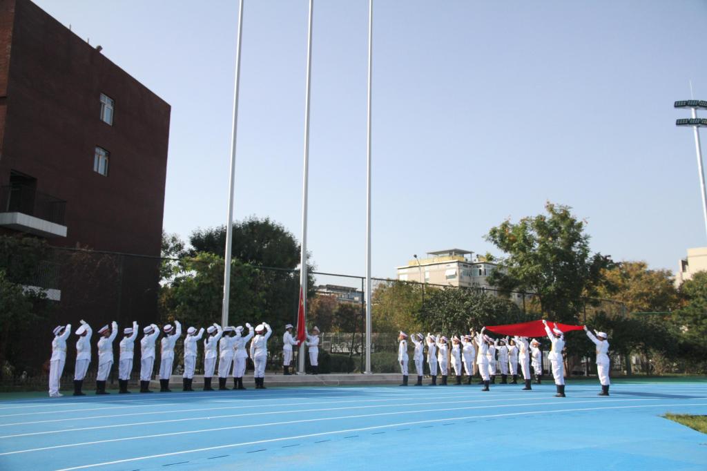 国旗仪仗队护送五星红旗走上升旗台。全体师生齐唱国歌,五星红旗冉冉升起。