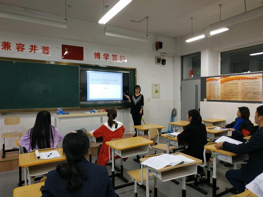 第一个环节,吴乃玉老师做了我校高中数学组申报并获立项的海淀区“十三五”教育规划2019年度课题-《基于校本学情的课堂时效性行动研究》的开题报告。报告就问题提出、文献综述、研究内容、研究方法与过程、研究预期成果及成果形式、课题组成员分工情况等六部分内容做了说明。参会老师对这份报告进行了热烈讨论,大家都提出了一些自己的想法和建议。李先印老师结合课题的研究和高三一轮的数学复习谈了自己的心得和体会;李妍老师就课题组成员的分工合作谈了自己的想法;李晖主任对这个课题的地位和意义做了重要的解读,认为它既是对高中数学组前三个课题的承接,又是对当前我校高中教研主题-打造简洁、清晰、直面核心知识的高效课堂的研究实践。