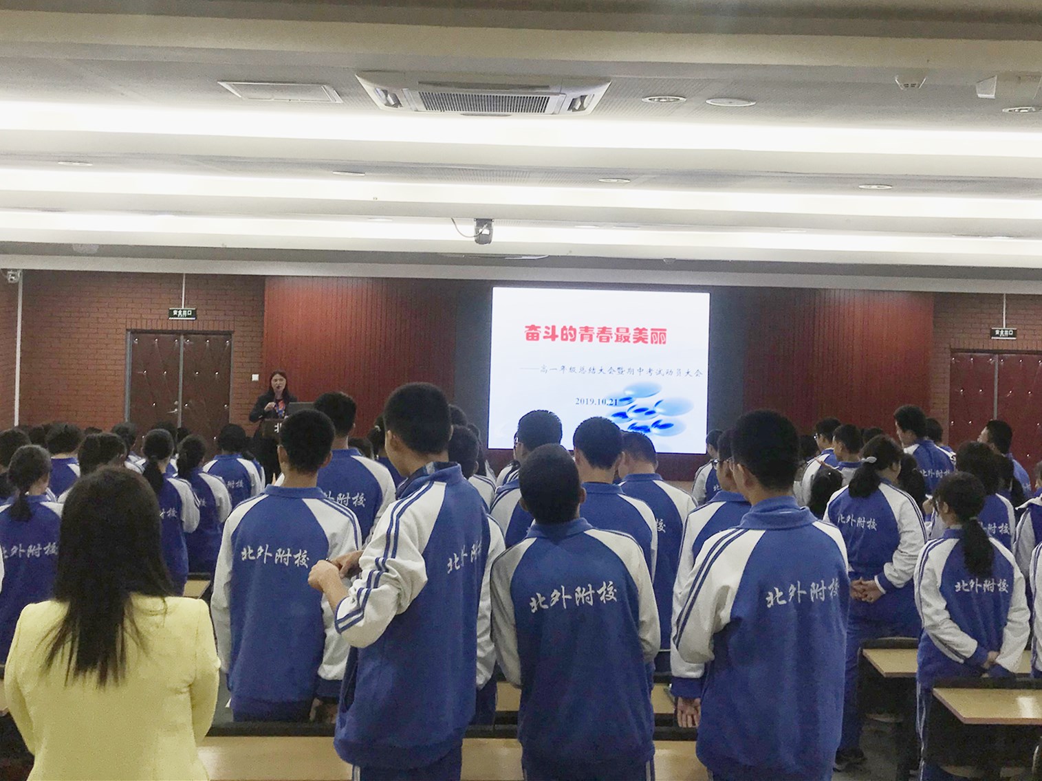 为营造浓厚的学习氛围,进一步调动学生的学习积极性,10月21日,北外附校举行以“奋斗的青春最美丽”为主题的“高一年级总结大会暨期中考试动员大会”。高一年级全体师生参加了本次大会,会议由年级主任杨继臻主持。