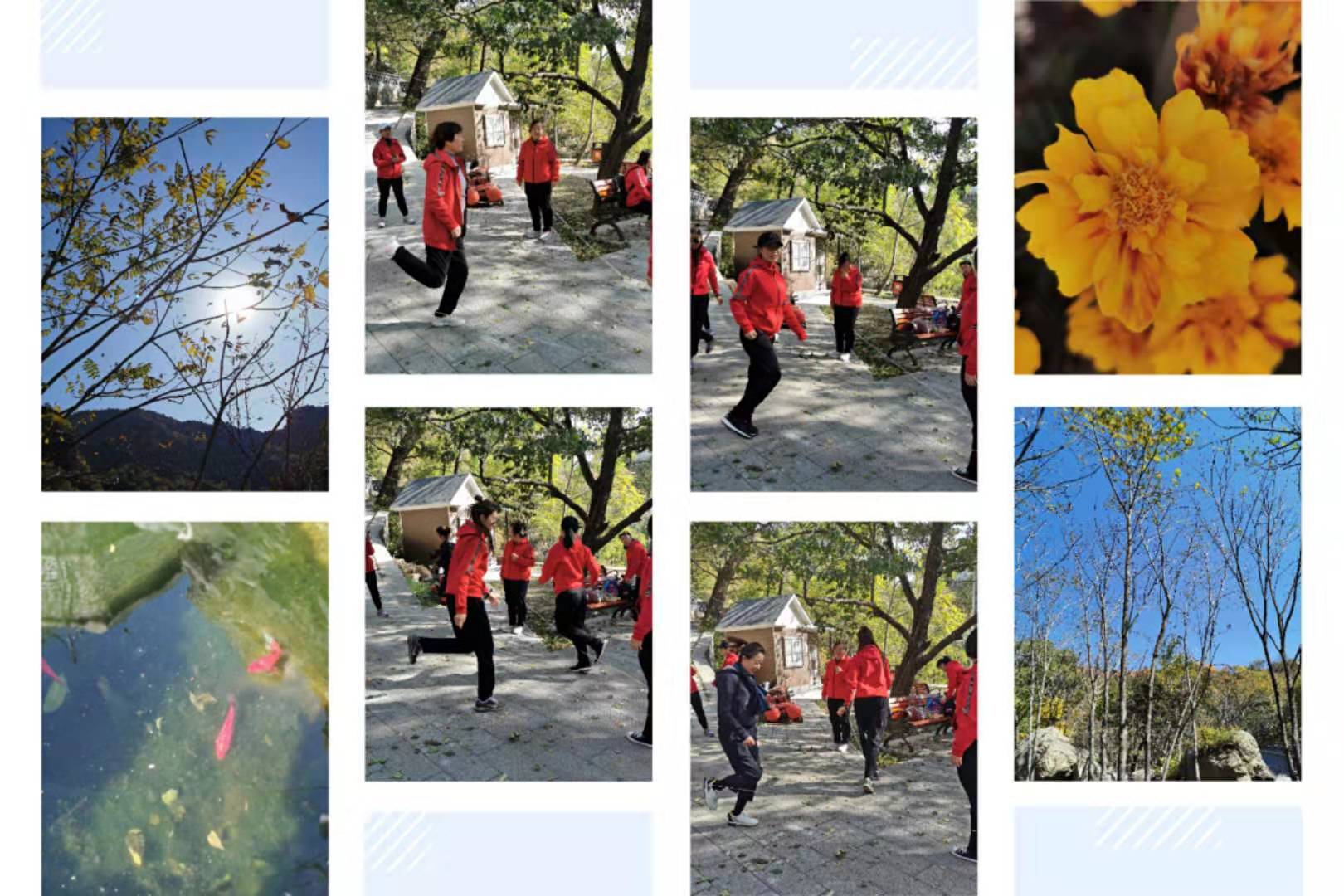 一进入到猕猴桃谷风景区,顿时投入大自然怀抱,青山绿水,群山绵绵映入眼帘,山野风景尽收眼底。接着老师们来到了采摘区,此时正是山里红和山楂成熟之际,树上的果子掉落在地上,老师们都忙不迭的弯腰捡果子,一边捡一边品尝新鲜的味道,很多老师在村民的热情介绍下第一次区分出了“山里红”和“山楂”:“山里红”个头较大,口感酸甜;“山楂”个头较小,酸味更重。采摘完后,老师们聚在一起分享自己的成果,沐浴在阳光秋风中,老师们回忆起幼时的游戏“跳皮筋儿”,玩儿的不亦乐乎。