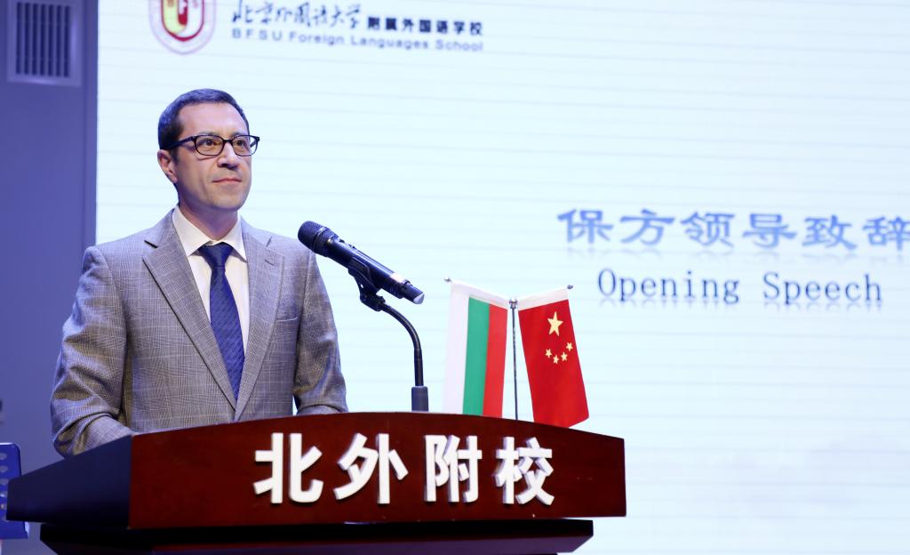 随后,保加利亚驻华大使格里戈尔-波罗扎诺夫先生致辞。他回顾了两国70年来所走过的友好交往历程,介绍了本次主题展选择在北外附校举办的初衷,就是希望中国越来越多的少年儿童能够了解和认识保加利亚,将来能够致力于为两国友好发展贡献新的力量,延续保中两国的友好情谊。大使先生在致辞中表达了自己对于中国的深厚感情与发自内心的喜爱,并与在场师生亲切互动。大使希望从我们的学校能够走出越来越多优秀的国际化人才,将来能够为推动保中两国友好发展助力。
