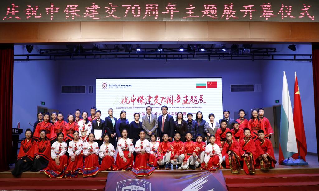 开幕式当天,保加利亚共和国总统夫人德西斯拉娃·拉德娃还发来贺信,贺信中写道:作为一名保加利亚人,我真心为保加利亚是世界上第二个承认中华人民共和国的国家这一历史事实感到骄傲!今年七月,中保两国共同签署协议将中保关系提升为战略伙伴关系,我想这是我们两国继续发展彼此间友谊的声明、愿望和意向,并且日臻成熟和睿智。在我们彼此间密切交往的进程中,北京外国语大学及其附属外国语学校的贡献也非常重要,你们作为新中国第一所外国语学校,享有“外交官的摇篮”美誉当之无愧。保加利亚共和国总统和我为能够在你们这里举办“中保建交70周年主题图片展”感到特别高兴,活动不仅可以促进保加利亚语言的学习,还能够向学生们介绍我们国家人民的传统、民俗和文化。请相信两个距离遥远国度间的亲密接触是完全可能的,这一点,我们已经证实了七十年。我相信,我们还将继续证实下去。