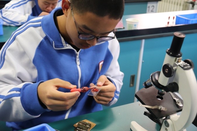 11月13日开展的则是有关于生物的实验活动,内容很贴近生活的 “检测花生内的脂肪”。同学们先是将花生小心翼翼的切片后,适量的涂上带有颜色的检测试剂,并学着尝试使用显微镜去观察现象,证明自己的猜想。辅导教师也在帮同学答疑解惑,同学们对于本次实验的体验度增添了不少收获。生物对于无论是同学还是老师都是一个与生活相互联系的一门学问。同学们在经过了这样细致的实验过后也会巩固对于相关领域知识。