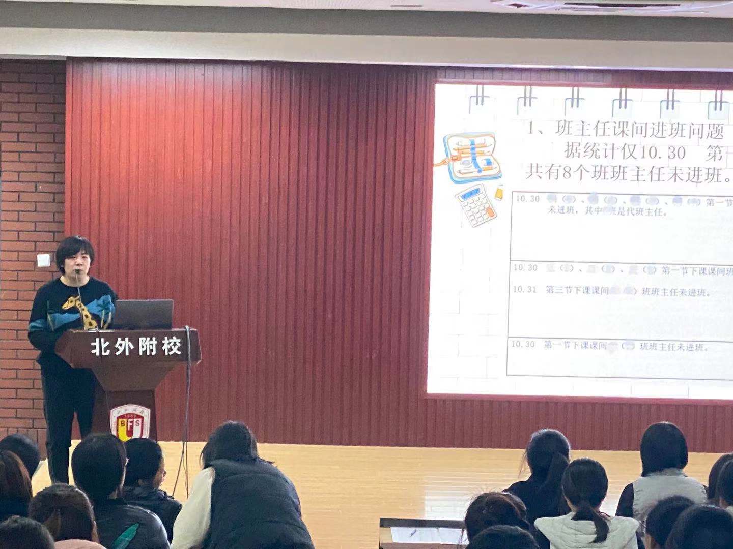 德育处干事王海琳老师就第10周和第11周德育常规检查情况进行通报反馈。王海琳强调班主任每个课间都要进班,保证学生课间安全;班级小柜门要关好,不让物品夹在外面;走班到专业教室上课不要迟到,上下楼梯要单列右行,避免出现安全隐患;班级常规表格填写要及时,不能出现提前填写或张贴不美观等问题。除了这些常规要求,王老师重点强调班主任老师要有安全意识,做到预防在先。首先要结合本班学生实际及环境特点,明确容易发生安全事故的点位;其次要及时排查安全隐患,包括各种硬件设施和由于各种活动引发的安全事故。王老师结合自身多年班主任工作经验,提出几个简单易行的小窍门,以提高学生安全意识:可以利用少先队活动课等时间播放一些有关安全问题的小视频,使学生内心受到触动;根据班级出现的问题,抓拍一些“现场”,请学生谈谈感受;让学生课间有事情可做,比如,玩玩汉诺塔,做个小游戏,干一些力所能及的活儿等;大课间时带孩子们去跑跑步,跳跳绳,使他们的精力得到释放,同时又能锻炼身体,学会保护自己……王老师鼓励老师们时时观察,处处留心,做解决安全问题的有心人。
