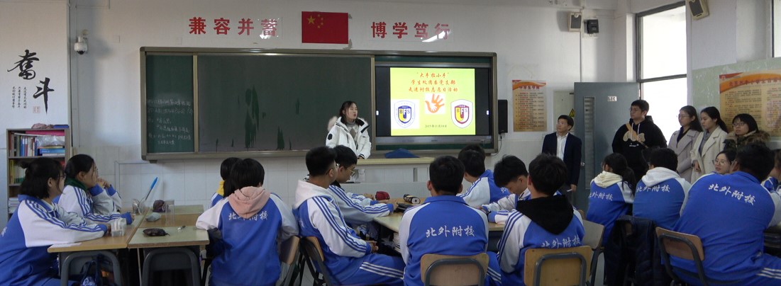 11月18日下午,北京外国语大学“‘大手拉小手’学生处团委党支部走进北外附校志愿日活动”顺利举行。北京外国语大学就业创业中心副主任兰建华老师、学工部辅导员张倩芸老师等共6人一起走进北外附校高二2班,组织了一次以“职业生涯与职业选择”为主题的高中生职业生涯规划活动。
