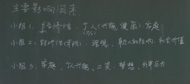 兰建华让2班同学自由分成三组,北京外国语大学的6位老师也分别加入各小组,共同讨论什么会影响自己的职业选择,最终每个组归纳大家共同认可的至少5个因素,并选一名代表总结发言。学生们积极踊跃发言,表达自己的想法。