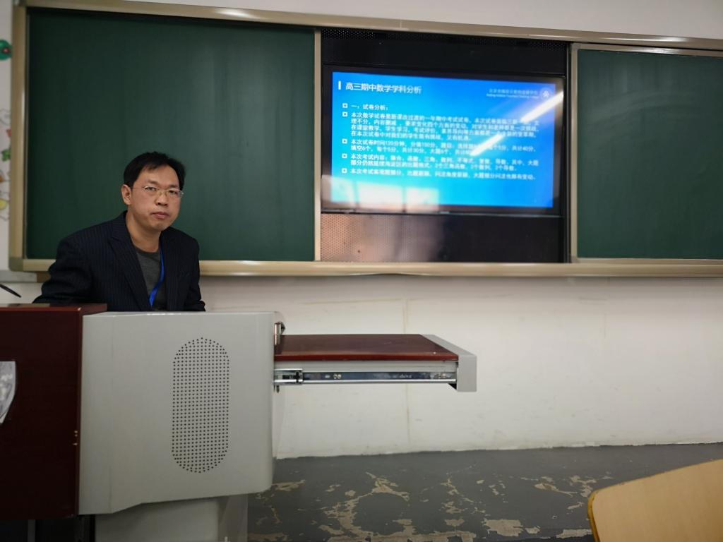 本次会议主要内容由高三备课组长李先印发言,发言题目为:高三期中试卷讲评——诊断、反思、总结;发言内容为:1:本次高三期中考试目标定位:(1)阶段性考试;(2)全面考察、突出重点;(3)突出诊断、促进改进;2:本次期中考试内容及各个知识点所占分值及比例;3:试卷以及试题分析;李老师很细致的分析本次试卷所考察的四基四能素养以、细致分析试卷中各个知识点所对应试题考查的方式和解决方法、细致分析此次试题和往年本阶段试题的相同点和不同点,同时预测今年命题所向;4:学生成绩分析;以区里成绩作为参照,李老师细致分析本次数学成绩平均分、优生率、低分率并详细列出目标生、总分上线而数学未达标的学生,以及线下学生名单;5:反思与措施:通过本次考试分析,李老师认为高三一轮复习应适当放慢速度,多给学生一些练习的时间,抓基础,练思维。对于高分段学生做好培尖,将低分段学生推上去,即促中间,抓两头。同时李老师还建议高一、高二教学要重视基础,注重培养学生的数学思维。
