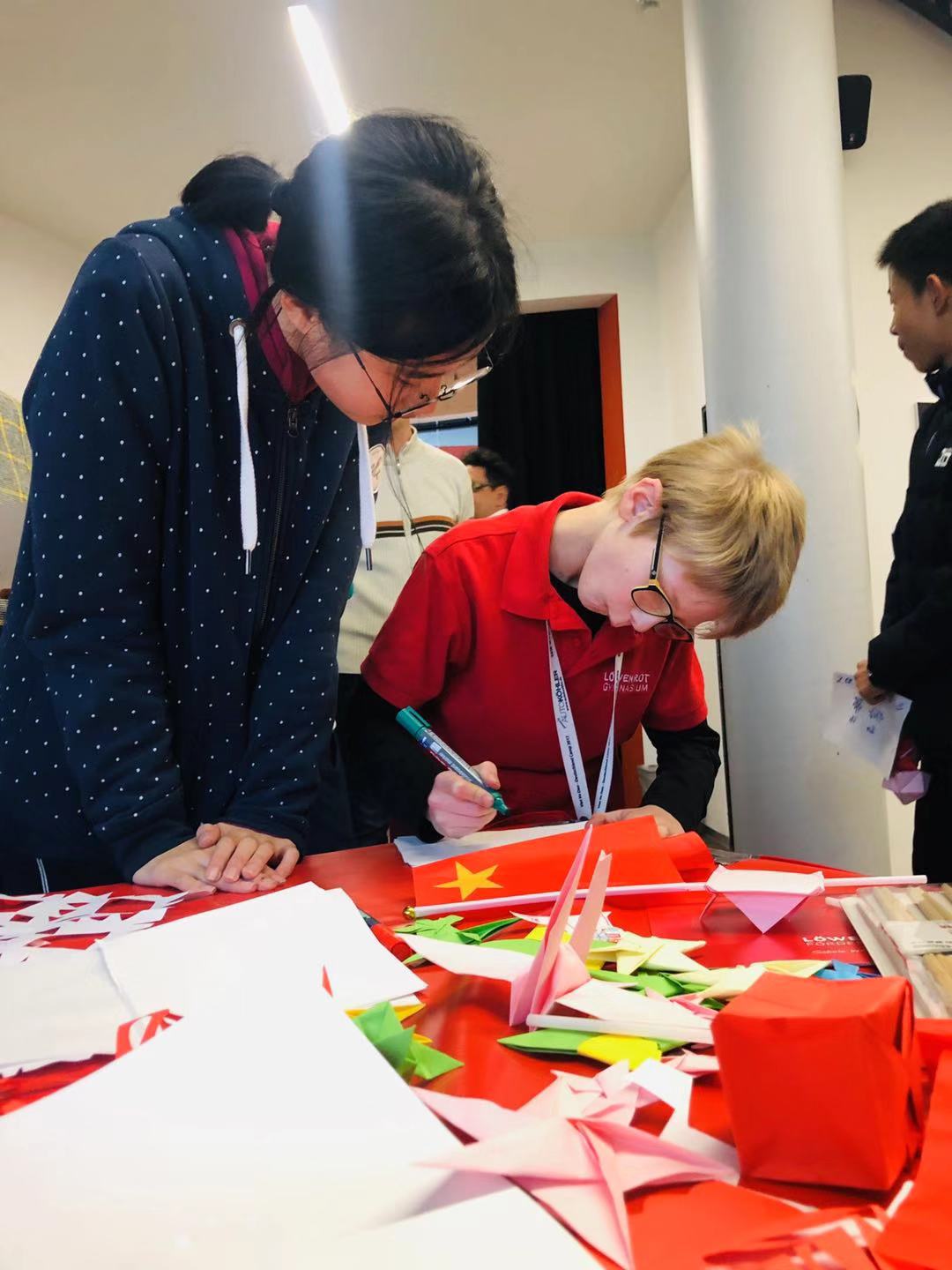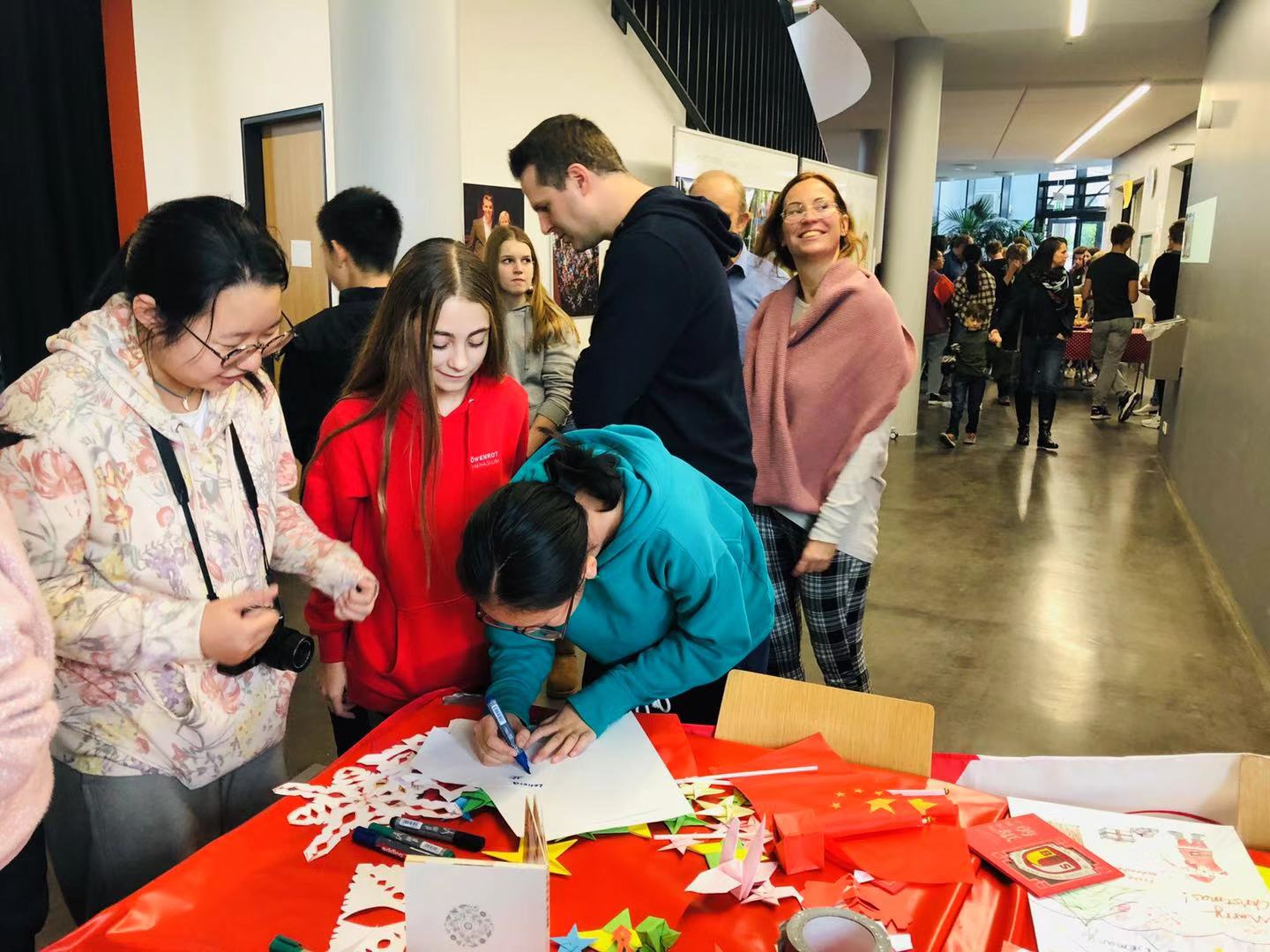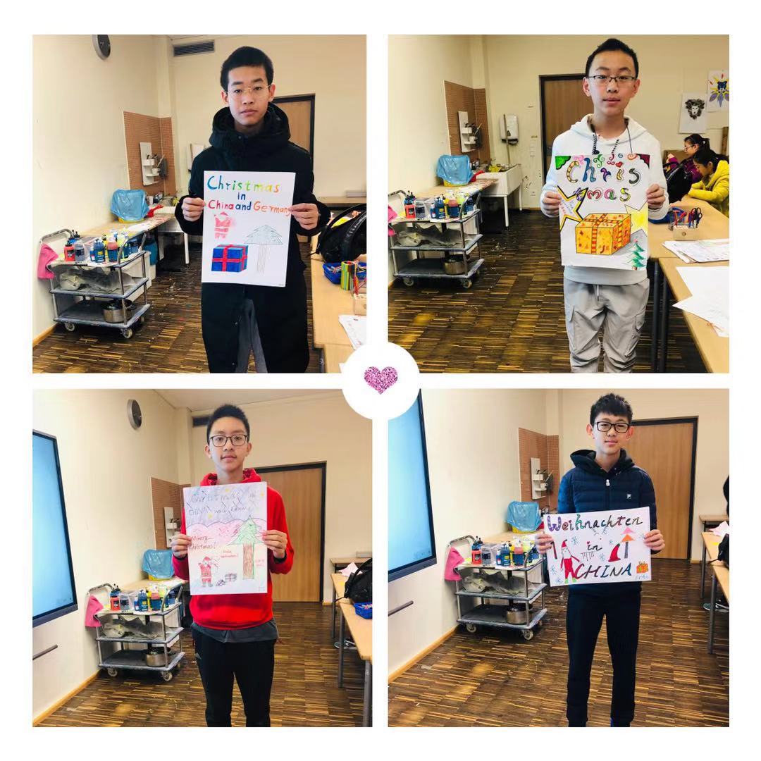 在最后的Adventskaffee(圣诞节前的集市活动)上,同学们精心布置带有中国特色的展位,摆上自己制作的圣诞海报和剪纸作品,还有象征着两校的“友谊杯”,同学们也运用流利的德语与来访的学生以及家长进行介绍宣传自己的“特色作品”。在迷你音乐会环节,同学们演唱了三首歌曲,两首德文歌曲《Kleine Kinder kleine Sorgen》、《OH,Tannenbaum!》以及中文歌曲《我和我的祖国》,自信的表演赢得了在场德国师生以及家长热烈的掌声。